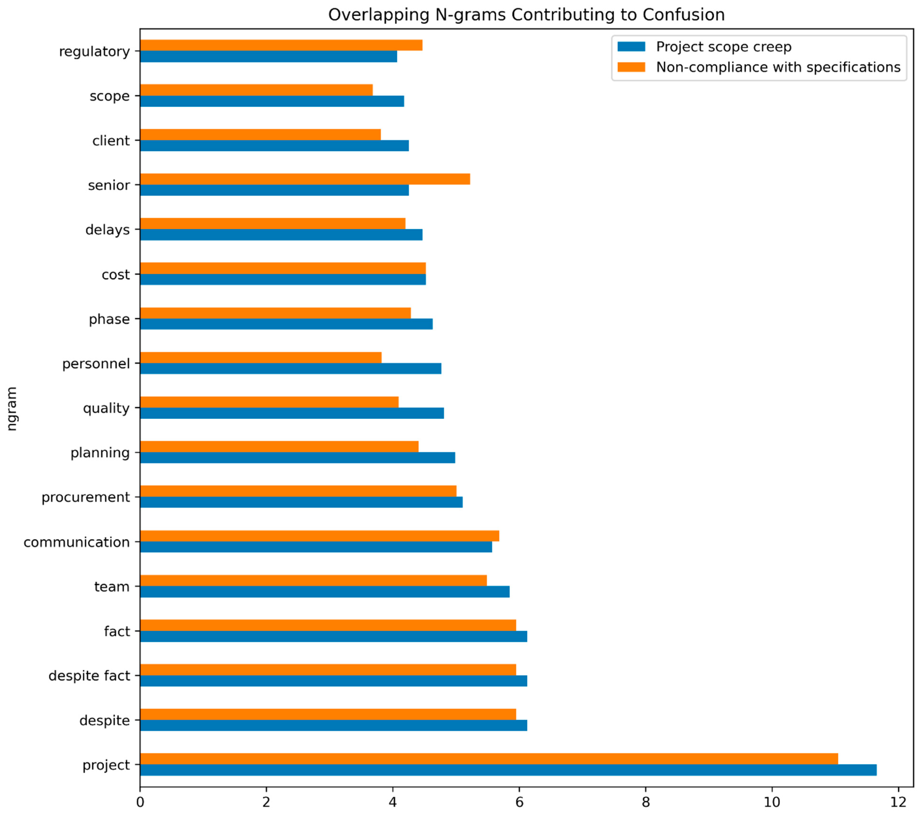 - For the Cost category, the specific n-grams are “cost project”, with the highest magnitude above 1, followed by “control caused”, “stakeholder”, “oversight”, and “caused oversight”, with significantly lower values for the magnitude.
