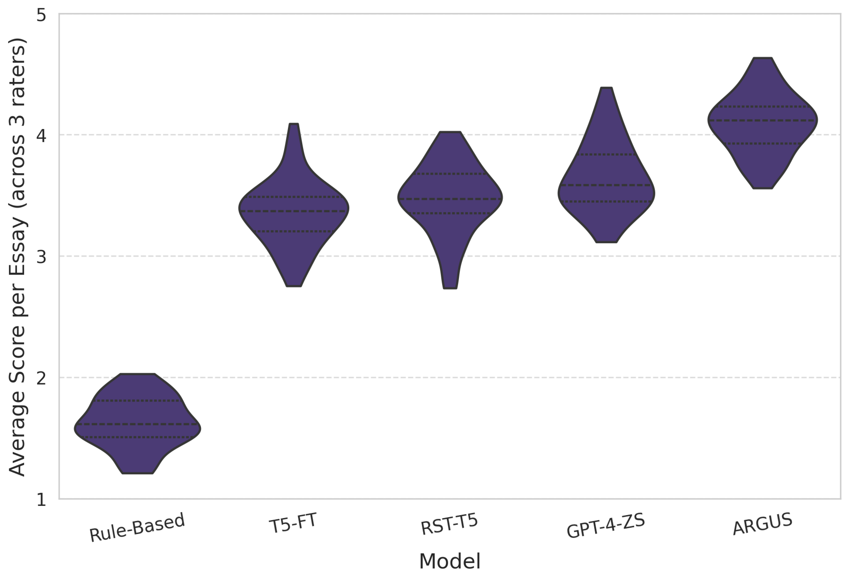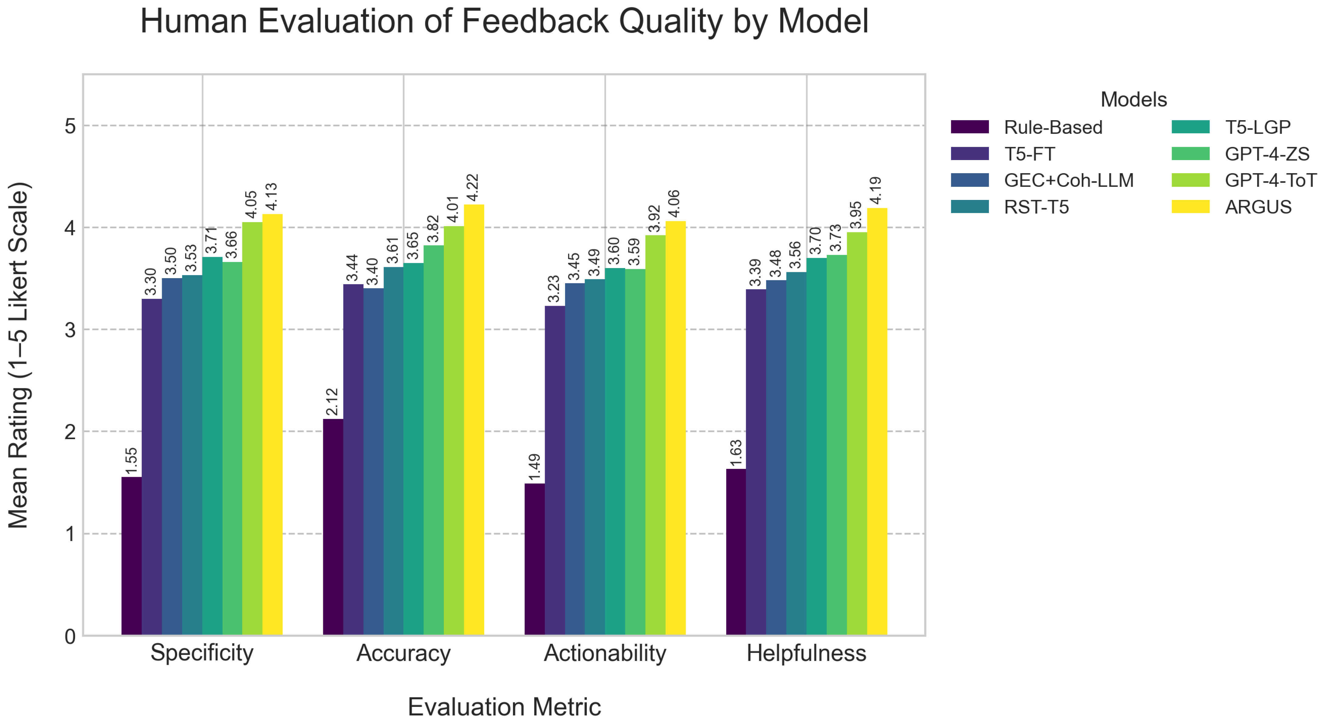 Feedback length was not explicitly controlled during generation. However, a post-hoc analysis revealed comparable average token counts for the main generative models (ARGUS: 63 tokens; GPT-4-ZS: 71 tokens; T5-FT: 55 tokens; RST-T5: 58 tokens), suggesting that observed differences in quality are not merely an artifact of verbosity. The Rule-Based feedback was naturally much shorter (avg. 16 tokens).