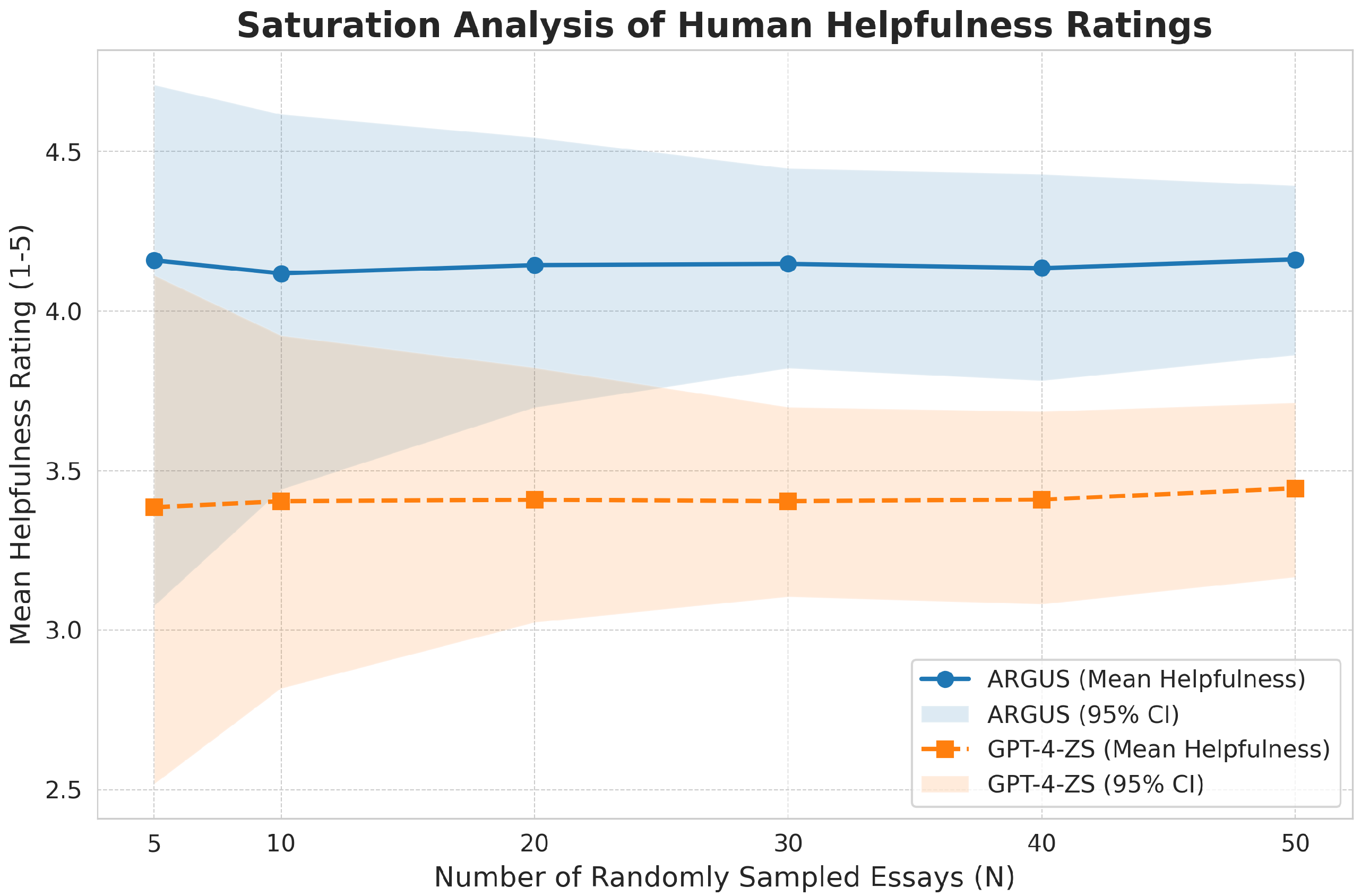 Finally, the ultimate measure of an educational system’s success is its impact on student learning. While a longitudinal study is necessary, we conducted two preliminary studies to assess pedagogical feasibility. First, a ‘revision feasibility’ proxy study found that experts preferred ARGUS’s revision path over GPT-4-ZS in 66% of cases (vs. 18%). Furthermore, a small-scale (N = 20 students, N = 3 instructors) follow-up usability study confirmed the feedback’s pedagogical value: students rated its comprehensibility (M = 4.4/5) and actionability (M = 4.2/5) as high, while instructors affirmed its diagnostic accuracy and high potential for classroom adoption (M = 4.5/5). These findings suggest our feedback can translate into effective revision, a hypothesis we will test in future classroom-based RCTs. This points toward integrating ARGUS into Learning Management Systems (LMS) to provide instructors with cohort-level analytics and support data-driven teaching.