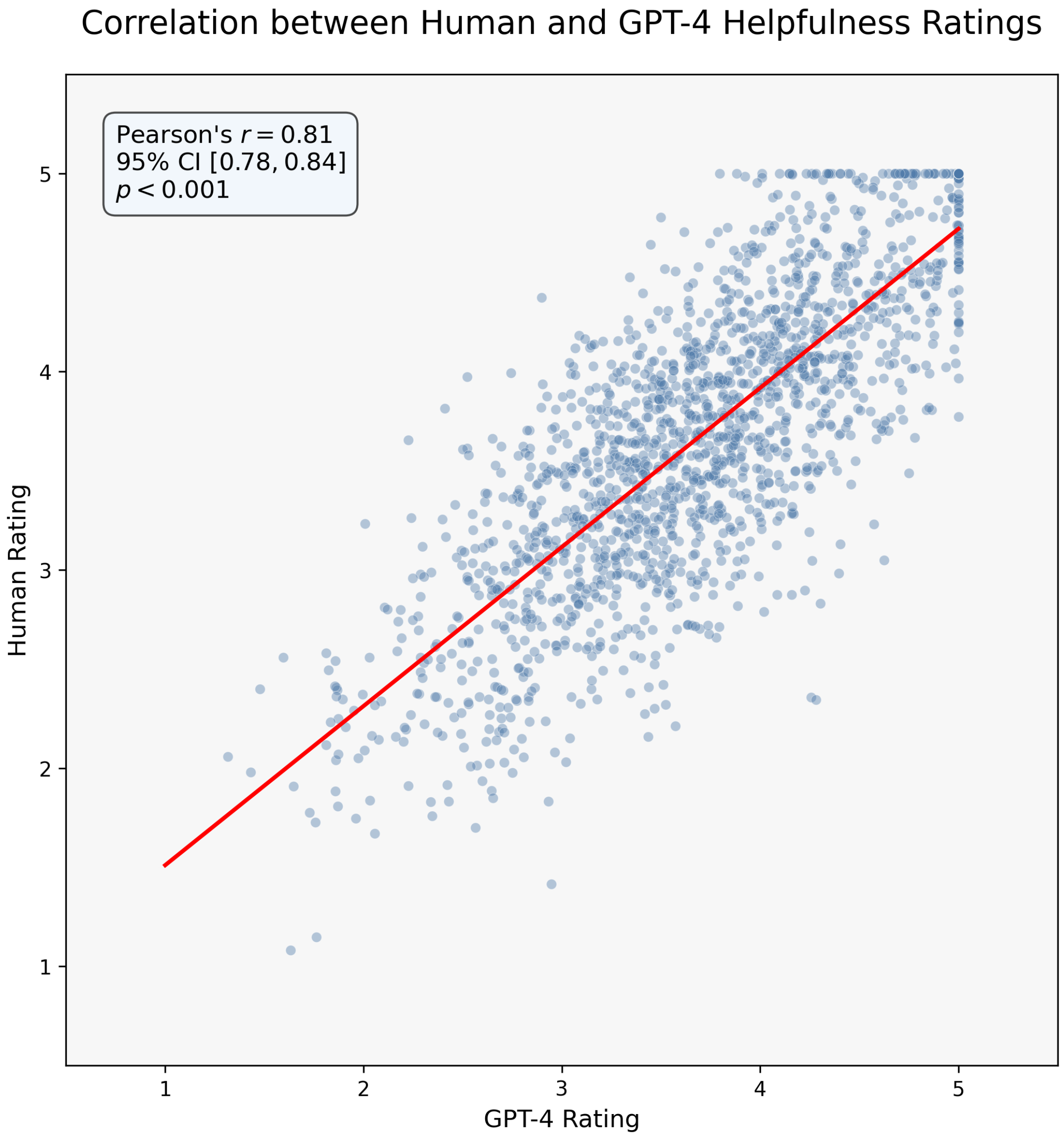 Recognizing the cost and scalability limitations of human evaluation, we explored the viability of using GPT-4 as an automated judge. The scatter plot in
