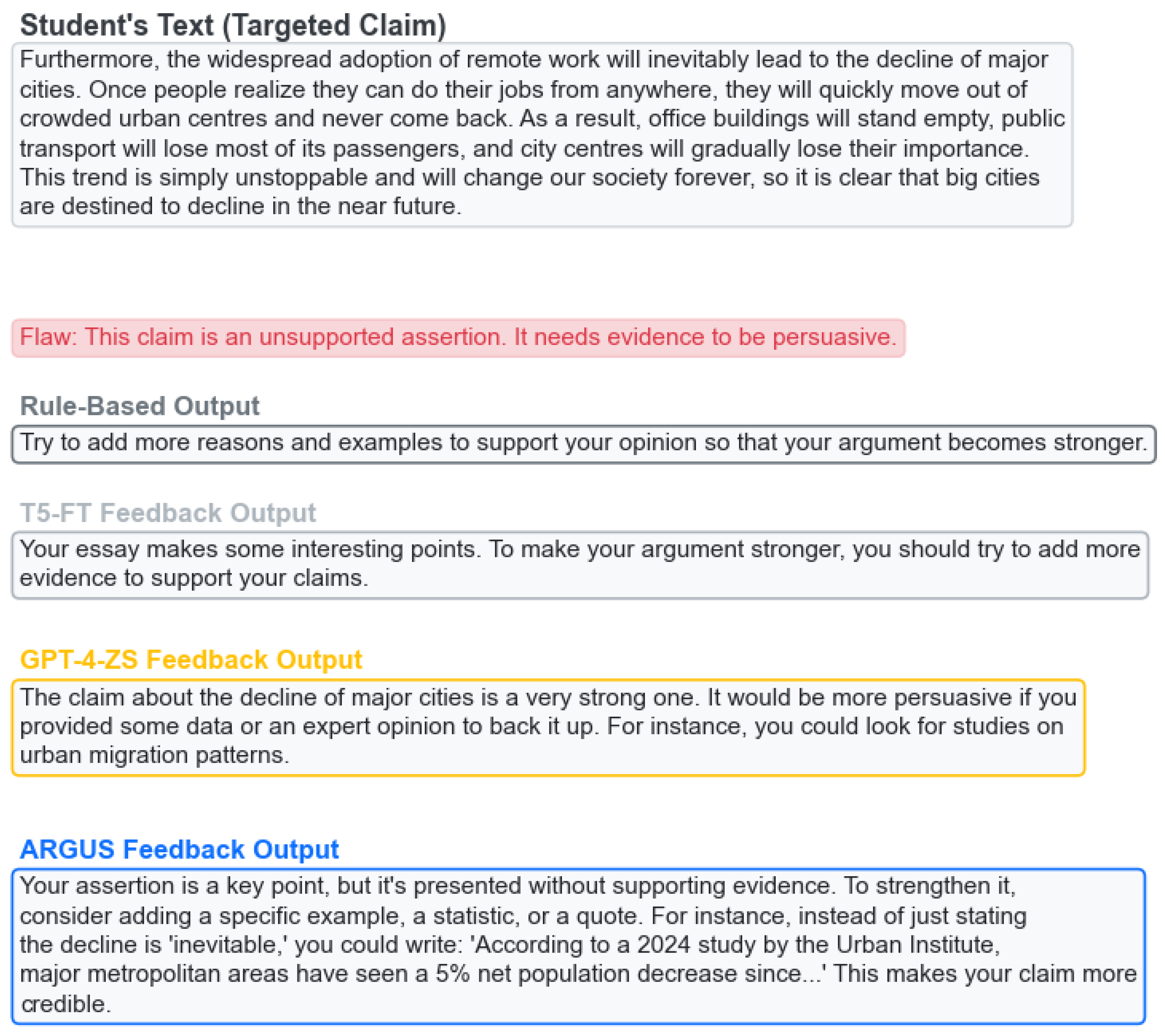 Table 4. The Rule-Based baseline produces a very short and generic comment (e.g., “Add more reasons to support your idea.”), reflecting its reliance on simple keyword heuristics rather than a structural understanding of the argument. The T5-FT output is generic, while GPT-4 provides good, actionable advice. The ARGUS feedback, however, stands out for its diagnostic structure. It systematically localizes the issue, quotes the problematic text, provides a clear diagnosis of the structural flaw (“presented without supporting evidence”), and then offers a menu of concrete strategies for revision. This structured, multi-part feedback is a direct output of the GNN-guided generation process and exemplifies the kind of specific, pedagogically-scaffolded guidance our system is designed to provide.