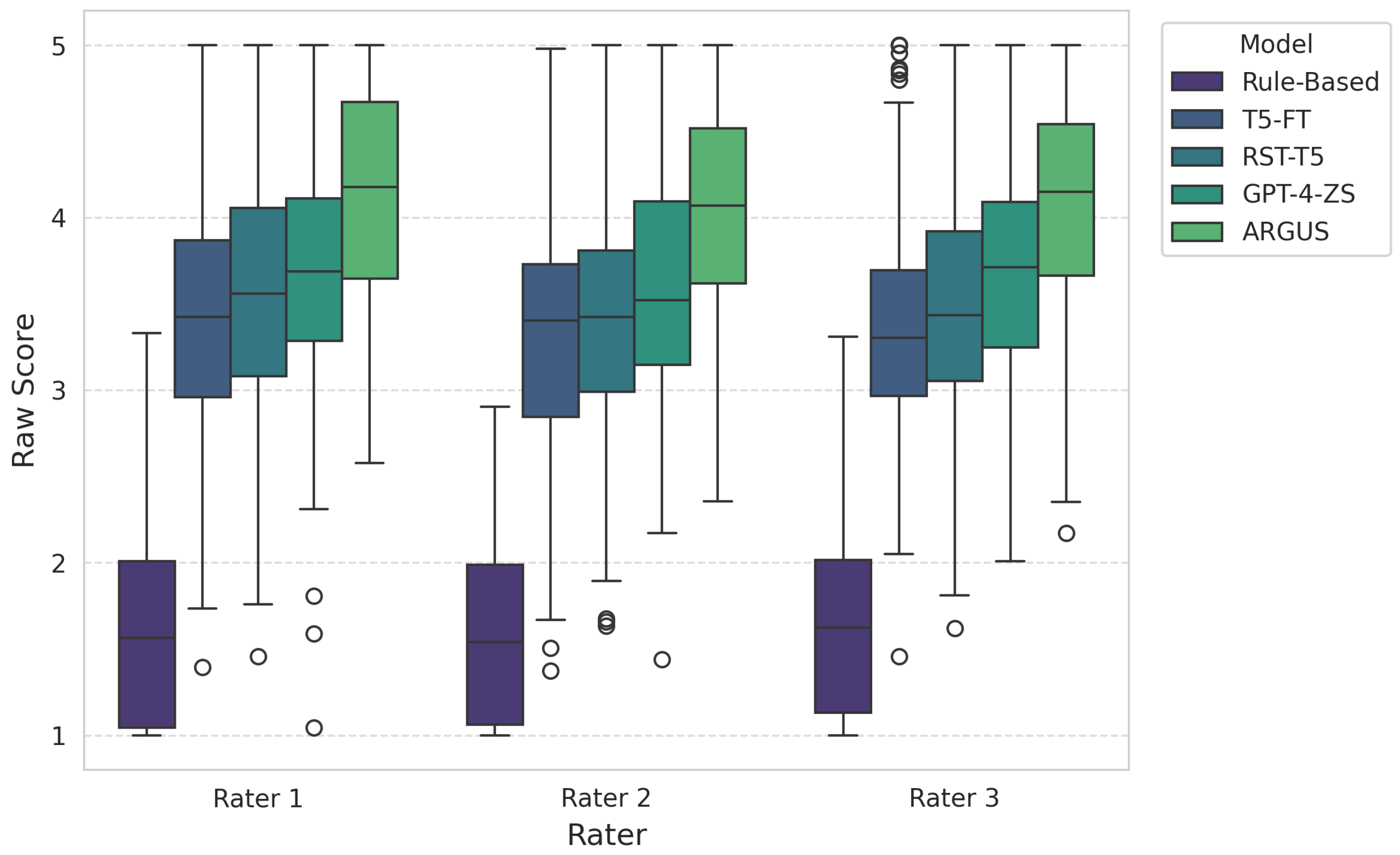 Table 4, show that ARGUS provides a consistent and meaningful advantage over all baselines. Wilcoxon signed-rank tests confirmed that ARGUS was rated significantly higher than all other models, including the new, strong GPT-4-ToT and T5-LGP baselines, on all four metrics (all Holm–Bonferroni adjusted