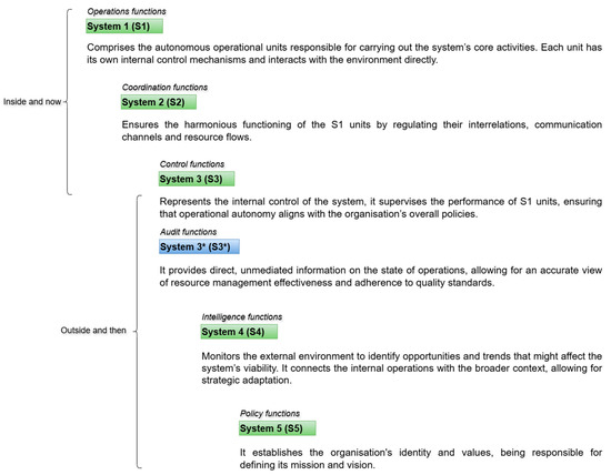 Each system represents essential functions that every organisation must have to adapt effectively to its environment and ensure long-term sustainability. A viable and sustainable organisation is one that is capable of existing independently without detaching from its ecological and social focus, while remaining aligned with the needs of future generations [51].