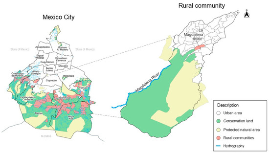 For this research, the study area selected was LMA, located within the borough of La Magdalena Contreras (Figure 3), which covers an area of 63.4 km2. This rural community maintains a close relationship with the Magdalena River, considered the last living river in Mexico City, with a total length of 28.2 km from its source to its confluence with the Churubusco River, of which 14.8 km are situated within conservation land [52].