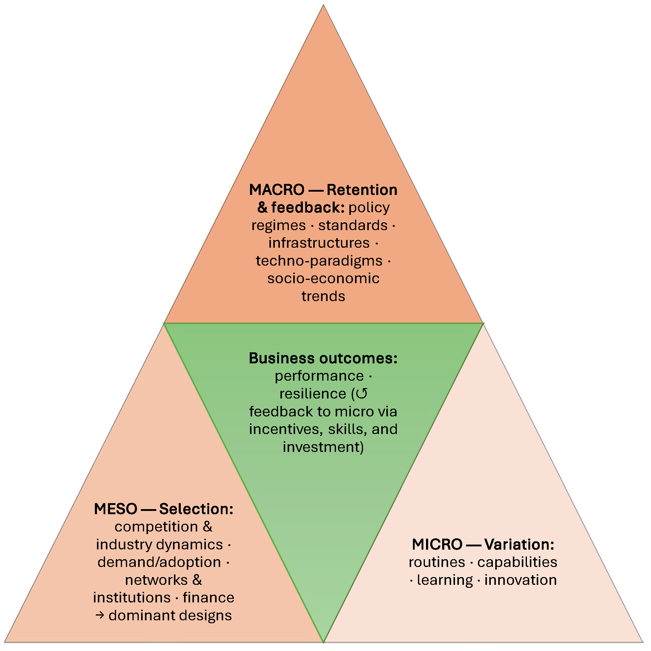 One of the most promising aspects of evolutionary economics for business education is its integration of macro-, meso-, and micro-level analysis. This framework—developed by scholars such as Kurt Dopfer and expanded by others—offers a coherent way to understand how individual firm strategies, industry dynamics, and macroeconomic trends interconnect [11,79,80,81,82].