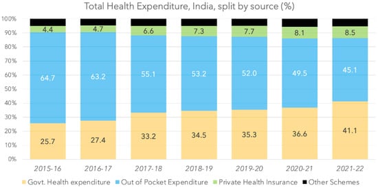 In the Indian context, government health expenditures (GHE) have contributed less than 50% of the total health expenditure (THE) and, consequently, Out-of-pocket expenditures (OOP) have remained above 50% [5,6,7,8,9,10,11], suggesting that health insurance has not played a significant role in offering financial protection to Indians and has failed to fill the large gap left by the government. Even in the longer run, as countries and states increase their contributions towards health and progress towards Universal Health Coverage (UHC) and reduce the extent of OOP, there will be a need for top-up commercial insurance that allows consumers to access and pay for services outside the UHC benefits package [12] and does not unleash inflationary pressures that can derail the entire country’s UHC journey [13].