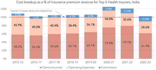 Figure 2. Cost breakup of the top 5 largest standalone health insurers in India. - Incurred-claims ratios of public sector insurers have consistently remained above 100% from 2018–2019 to 2022–2023 [15], and the largest specialized private health insurers have consistently reported underwriting losses (Table 2).
