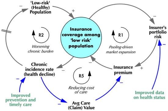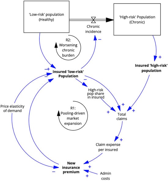 - The chronic insured population is modeled as an auxiliary, assuming 100% interest in insurance irrespective of price (i.e., the chronic population is price-inelastic). This allows the model to remain parsimonious while capturing the key dynamics.