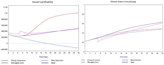 The conceptual model in Figure 3 is a simplified diagram of our system-dynamics model. It depicts the dynamics of an insurance system where a population is divided into two groups, reflecting the individuals’ health status: the low-risk or healthy population and the high-risk, chronic population. The chronic incidence rate governs the transition from a healthy or low-risk population to a chronic status or high-risk population, reflecting the percentage of healthy individuals who develop chronic conditions in a given period. The upper part of the model tracks population health, and the lower half tracks market dynamics of health insurance. Our model has a 30-year run time, with insurance policies being bought and claims raised on an annual basis: at the end of each year, the insurance lapses and needs further renewal, creating a fresh market dynamic every year. This long-term perspective allows for observing trends across the fast-changing insurance market dynamics and their interaction with population health. The flow between the health status is unidirectional, from healthy/low risk to chronic. The insurer in the model represents the health-insurance industry, governed by market demand from low-risk and high-risk populations, and is driven by a profit maximization mechanism which determines the price of insurance, as described in Section 2.3.3. For our policy comparisons, we model a population of 1000 individuals and compare runs over 30 years. Initially, 90% of the people are healthy, while 10% of the people suffer from chronic conditions.