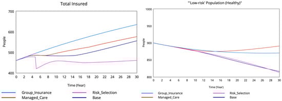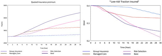 - The ‘low-risk’ or healthy insured population is derived from a stock of ‘low-risk fraction insured’, with flows governed by price sensitivity (elasticity) and adjusted yearly based on insurance price dynamics.