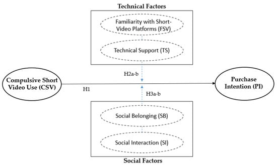 Building on this view, the present study conceptualizes compulsive short-video use (CSV) and purchase intention (PI) as unfolding within a broader socio-technical configuration. The underlying assumption is not that CSV deterministically leads to PI, but that this linkage is conditioned by how social and technical subsystems are configured on the platform. To capture the technical subsystem, we focus on platform familiarity (FSV) and technical support (TS). Platform familiarity reflects users’ accumulated experience and fluency in navigating short-video interfaces, which reduces friction in information search, product evaluation, and checkout processes [16,39]. Technical support captures perceptions of system reliability, responsiveness, and functional smoothness, which foster trust in platform-mediated transactions and lower perceived uncertainty around embedded commerce [3,4]. Prior STST-inspired studies on digital platforms similarly show that technical affordances such as interactivity, personalization, and system quality shape whether users can translate their motivations into concrete behavioral outcomes [21,31].