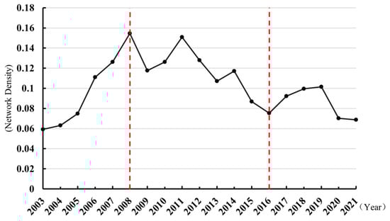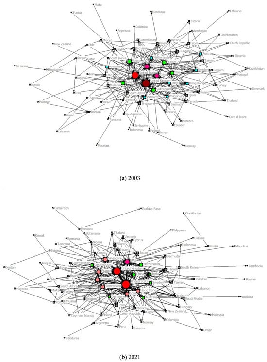 Firstly, there has been a significant increase in network density, accompanied by a notable increase in volatility (Figure 1). From a density of 0.059 in 2003, it increased to 0.0687 by 2021—an overall rise from the baseline period, but exhibiting an M-shaped fluctuation. The period between 2003 and 2008 was characterised by rapid expansion, followed by a significant decline in the aftermath of the 2008 financial crisis, with a subsequent gradual recovery that commenced in 2016. The cyclical nature of investment relations closely aligns with fluctuations in the global economy and financial markets, indicating heightened sensitivity of cross-border investment in financial services to external shocks.