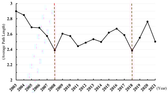 Secondly, the average path length has progressively shortened (Figure 2). The average path length decreased from 2.899 in 2003 to 2.502 in 2021, representing a reduction of 13.7%. This phenomenon signifies an enhancement in network accessibility, with the physical distance required to establish investment relationships between any two countries progressively diminishing. Consequently, the accessibility and transmission efficiency of global financial services investment have improved markedly.