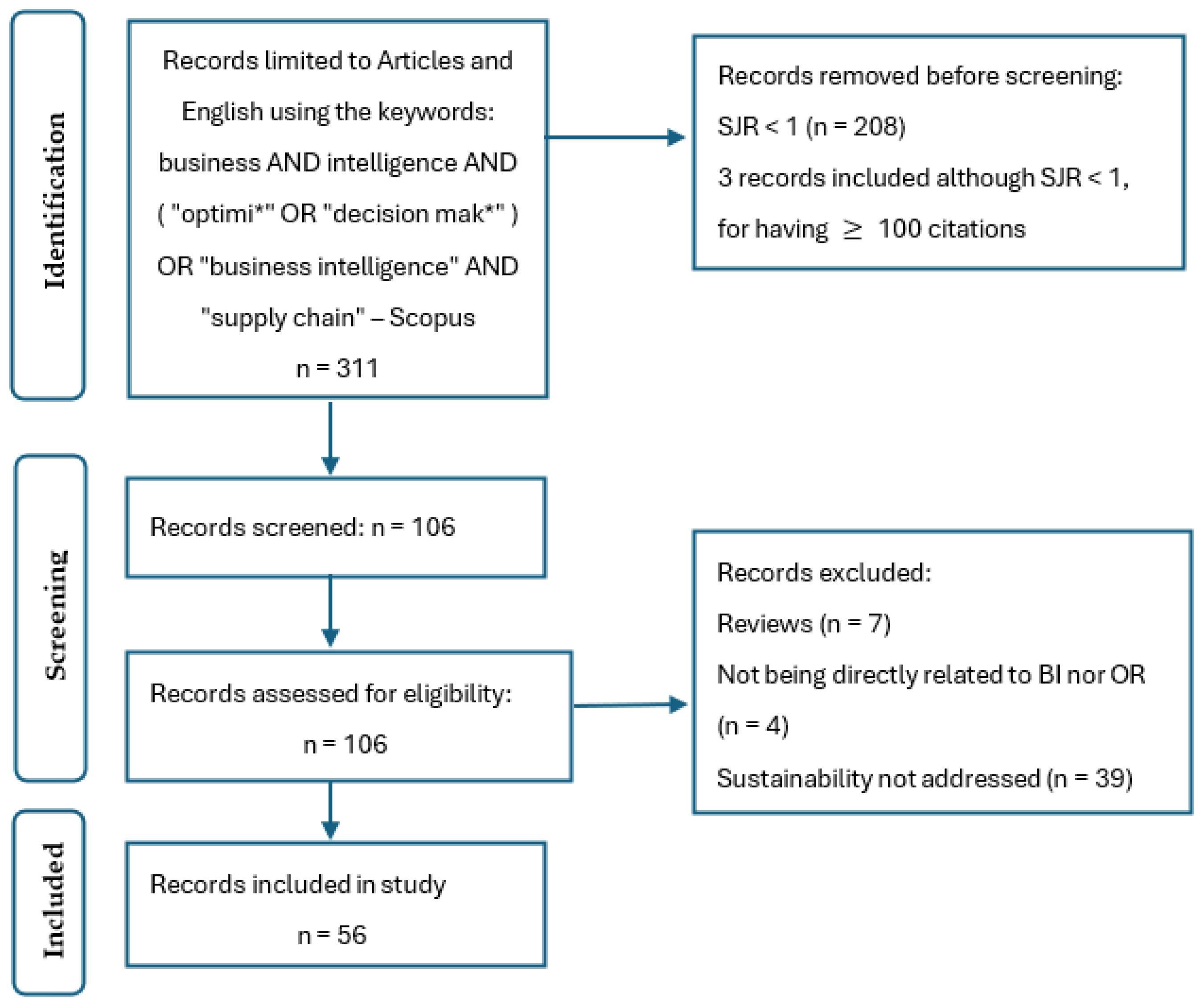 8], papers focusing solely on BI were not excluded, since the current review examines how BI and/or OR can enhance sustainability issues and goals in supply chains, and not only how they are integrated together. However, in this study, papers unrelated to sustainability were omitted, eliminating 39 records. Thus, the final sample comprises 56 peer-reviewed papers.