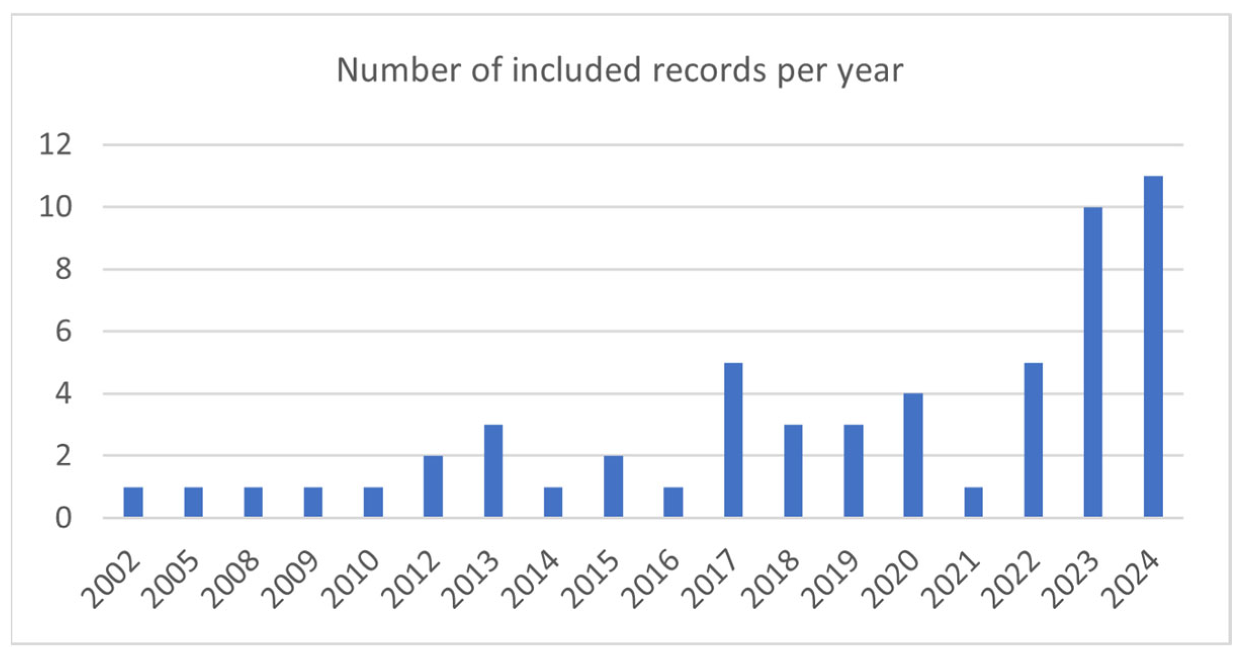 The 56 papers included in this study were published between the years 2002 and 2024, more than half of which were published from 2020 onwards, as summarized in