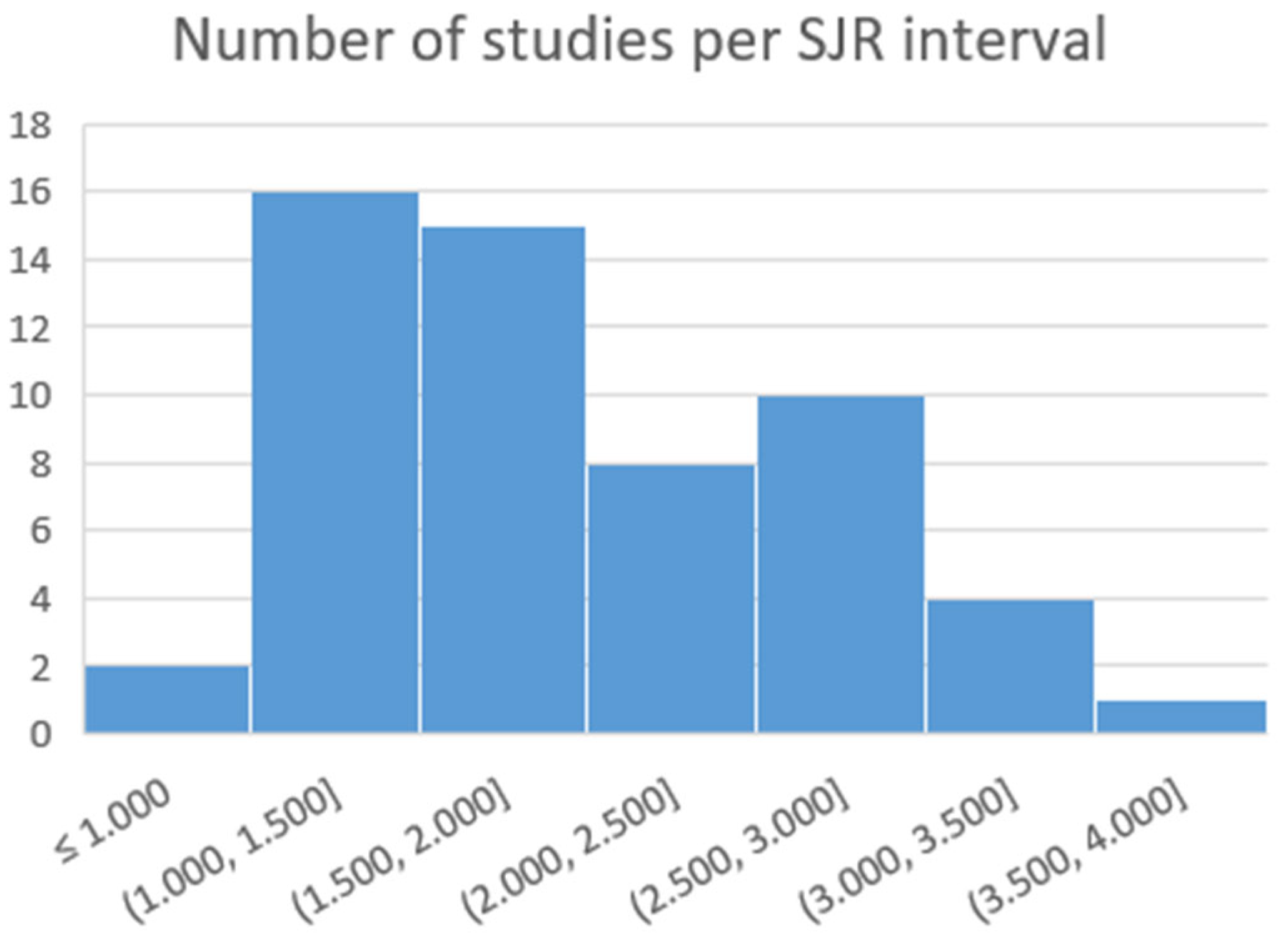 Figure 3. Note that there are two papers belonging to the ≤1 interval, which includes one of the three studies with more than 100 citations in a journal with an SJR < 1 (the other two studies were excluded in the screening phase) and a paper from a journal with an SJR = 1. Of the 56 papers, almost 60% are in journals with an SJR between 1.5 and 3.
