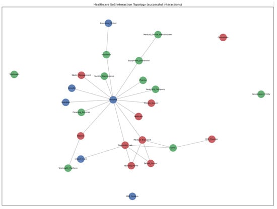 This network visualization illustrates the successful interactions among heterogeneous healthcare entities, with nodes representing individual systems (e.g., hospitals, insurers, diagnostic labs, patients) and edges indicating completed interactions that complied with the required interface methods (CICs), as illustrated in Figure 3. Node colors correspond to the compliance strategy adopted by each system: manual (green), automated (blue), and blockchain (red). The Hospital node occupies a central hub position, reflecting its role as a major connector across multiple categories, including insurance, diagnostic labs, and support services. Similarly, nodes like Pharma, Equipment_Distributor, and Medical_Transport form secondary hubs linking specialized services to clinical care providers. Notably, peripheral but essential actors—such as cleaning services, guardians, and transport—are explicitly connected through governed interactions, reinforcing the socio-technical scope of the model. The distribution of links reveals polymorphic interaction modes, such as automated device registration, blockchain-verified claims, and manual review of sensitive processes like insurance claims, highlighting how heterogeneous validation ensures both interoperability and contextual trust.