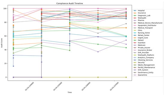 Figure 5 illustrates the temporal evolution of compliance audit scores across constituent systems within the CIC-governed healthcare System-of-Systems. The compliance audit scores illustrate natural fluctuations and gradual degradation over time, reflecting the effects of random perturbations that simulate real-world operational drift. By jointly visualizing audit scores with observed violations, the figure contextualizes system-level resilience and fragility: resilient systems sustain high scores with minimal violations, whereas fragile ones exhibit sharp declines or persistent underperformance. The time-series traces further highlight the impact of governance interventions—such as quarantining or policy adjustments—on system trajectories, distinguishing between cases of recovery, stabilization, or continued failure. These dynamics substantiate the proposition that CIC provides a governance mechanism that enables external monitoring and targeted remediation while respecting internal autonomy. Importantly, the model illustrates that governance is not purely punitive; rather, it is structured to uphold systemic integrity by permitting graceful degradation and subsequent recovery among constituent systems. In doing so, the governance framework demonstrates its capacity to adaptively maintain overall performance while accommodating heterogeneity in operational behaviors across the healthcare system-of-systems.