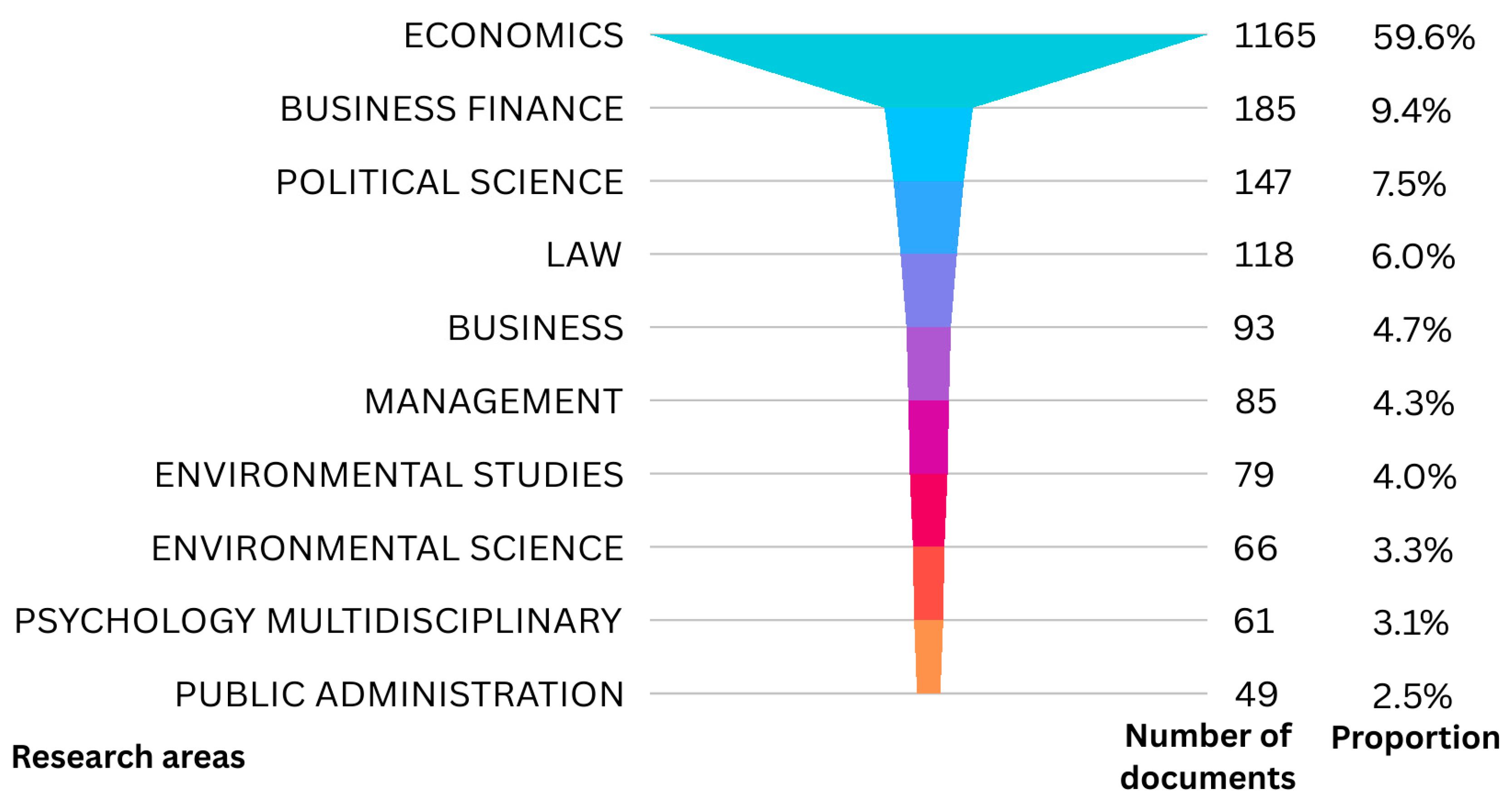 According to this categorisation of studies, approximately 70% of the Web of Science-indexed papers related to tax evasion and shadow economy concepts originate from the economics (1165) and business finance (185) fields, indicating that these are the primary research areas for our topic of interest. Considering that the regulation and control of economic activities fall under the responsibility of tax administrations, it was expected that the economics-related regions would have a higher share in the total number of studies on this topic. The finding reinforces the central role of economic theories and business practices in understanding and addressing issues related to tax evasion and the underground or shadow economy by analysing how individual and collective economic behaviours influence illegal or unrecorded economic activities. Research focused on economic theories, such as those related to tax incentives, consumer and firm behaviour, and the cost–benefit analysis of tax evasion, is of interest because it provides a fundamental understanding of the motivations underlying tax evasion. Authors can better explain why tax avoidance occurs and the conditions that encourage such behaviour by exploring how individuals and firms respond to various tax incentives. Additionally, business practices, including tax planning strategies, corporate structures, and tax risk management, play a crucial role in shaping the environment that fosters tax evasion and the underground economy. Understanding these practices allows researchers to identify how economic actors exploit regulatory loopholes or opportunities to minimise tax obligations. By integrating economic theories with business practices, the authors aim to propose more effective solutions to combat tax evasion through informed adjustments to tax policies, regulations and control mechanisms, which can ultimately foster a more compliant and transparent economic system.