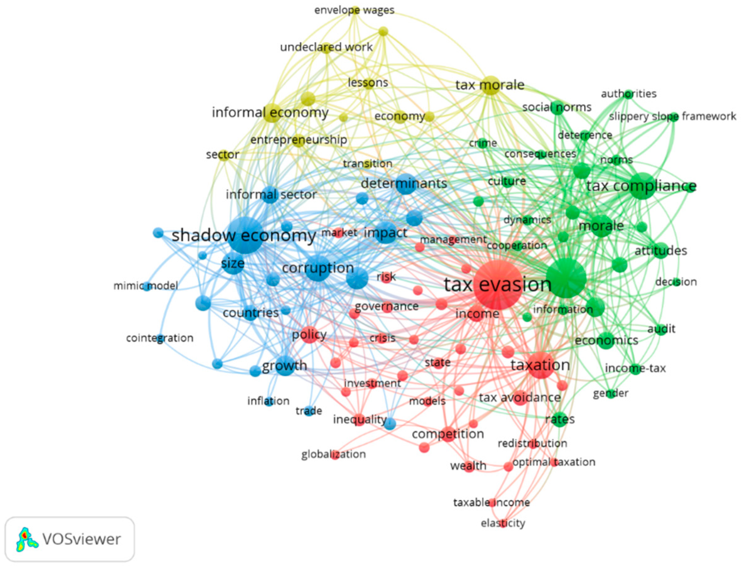 The bibliometric analysis performed to address tax evasion and the shadow economy evidenced that most studies on these concepts are concentrated in the fields of economics and business finance. This highlights the central role of economic theories and business practices in understanding tax evasion, as these areas provide insights into the motivations behind tax avoidance and the strategies that facilitate unrecorded economic activities. In addition, 105 keywords related to the selected research topic were identified, forming a total of four research directions: (i) the current research framework on the classical concepts of tax evasion and the shadow economy, highlighting government measures, economic performance, and risks such as globalisation and inequality and the importance of clearly distinguishing between terms like “tax avoidance” and “tax evasion” to ensure consistent definitions for effective policy design, accurate measurement, and reliable comparisons across countries; (ii) a specific research trend framework on tax evasion which examines the implications of cultural and behavioural factors influencing tax evasion, such as attitudes, social norms, and trust; (iii) a research trend on the relationship between undeclared work and the shadow economy, highlighting the frequent substitution of terms like “hidden economy” and “informal sector” in the literature and (iv) a research direction which examines the implications of the shadow economy on the level of entrepreneurial activity within a state, suggesting that informal markets can influence entrepreneurship by creating unregulated opportunities.