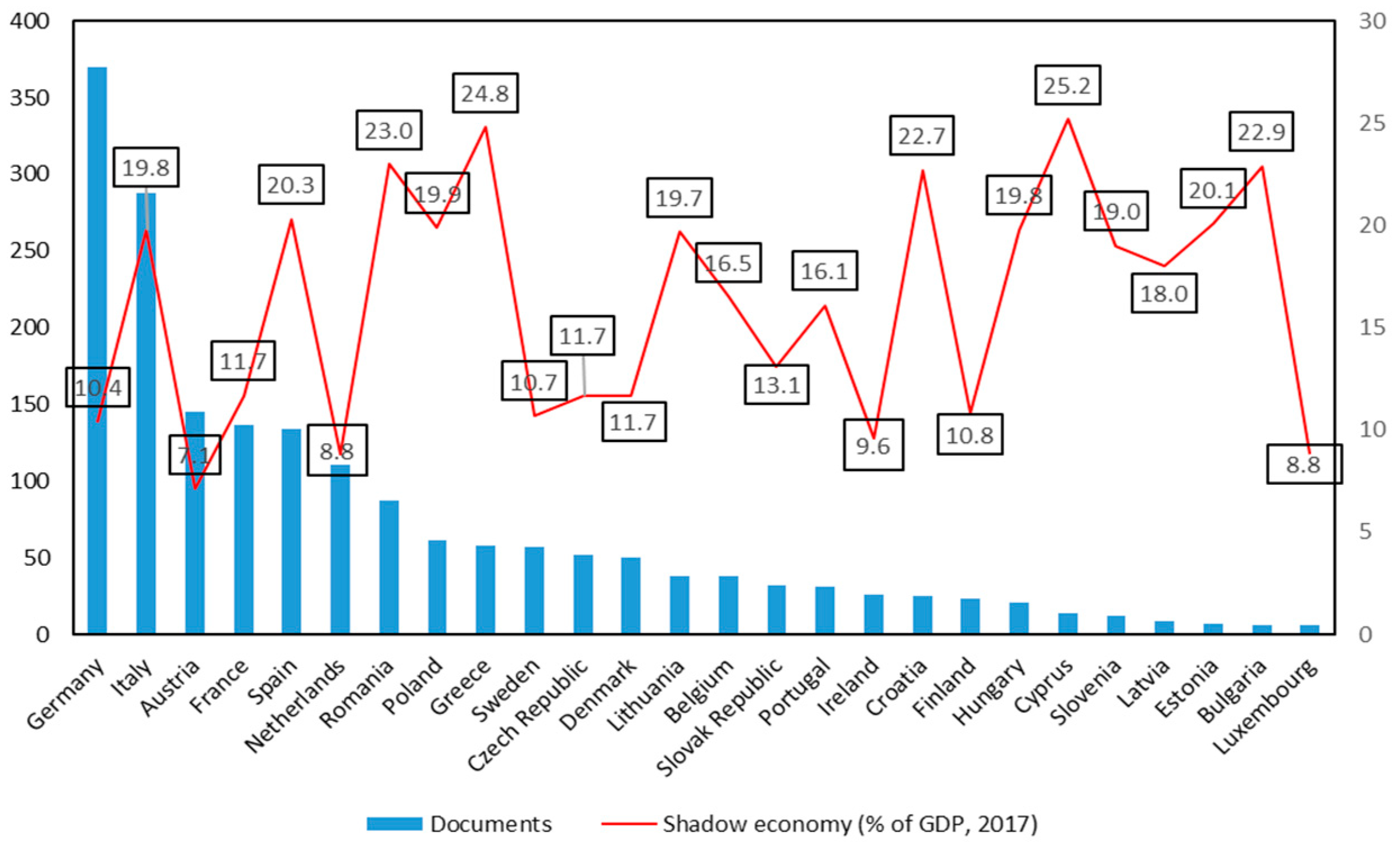 Figure 3 reveals the following trend: as the number of published papers decreases, the size of the shadow economy tends to increase relative to the gross domestic product (GDP). This suggests that countries with lower research output on the topic may be less engaged in studying and addressing the shadow economy, possibly leading to a lack of policy focus or inadequate measures to combat its growth. This suggests that countries with lower research output on the topic may be less engaged in studying and addressing the shadow economy, possibly leading to a lack of policy focus or inadequate measures to combat its growth. Additionally, the data reveal that countries with higher levels of the shadow economy are predominantly located in the Balkan region, including Cyprus (25.2%), Greece (24.8%), Romania (23%), and Bulgaria (22.9%). Conversely, countries with lower shadow economy levels include Germany (10.4%), Ireland (9.6%), the Netherlands (8.8%), Luxembourg (8.8%) and Austria (7.1%). This pattern may indicate that countries with greater research efforts and attention to the issue have more effective strategies for reducing the size of the shadow economy.