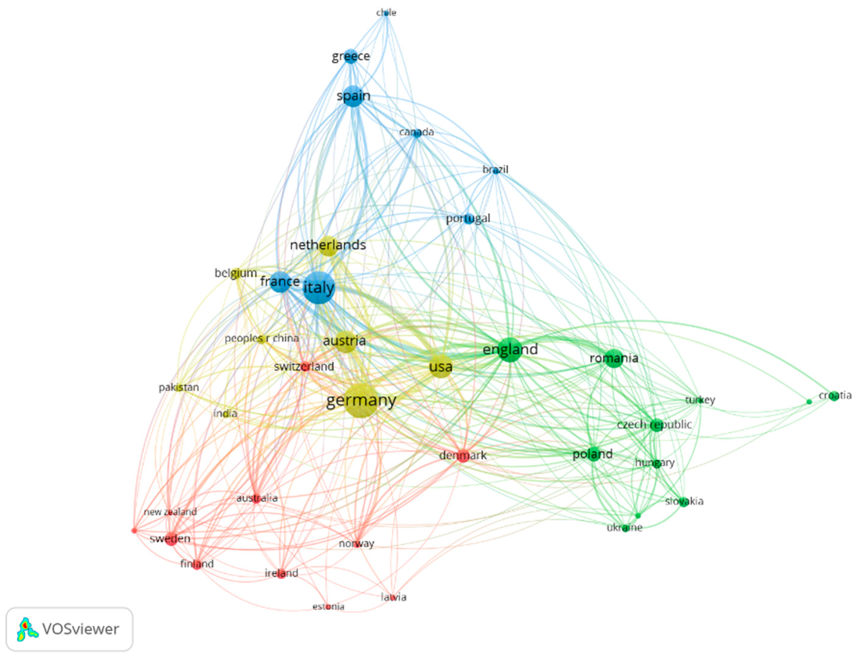 Our bibliometric analysis continues with the network of collaborations between countries through co-authorship, considering a minimum of 10 papers per country and a minimum of 100 citations per country. Based on worldwide publications, out of 98 countries, 38 met the threshold. Regarding the scientific productivity of EU countries, as measured by articles indexed in the Web of Science, published in English from 2000 onwards, Germany leads with 449 papers, followed by Italy with 377 papers, Austria with 179 papers, and France with 175 papers. At the other end of the spectrum are the Baltic countries, with 10–14 published papers. The graphical representation of the worldwide networks of co-authorship, based on countries, is captured in