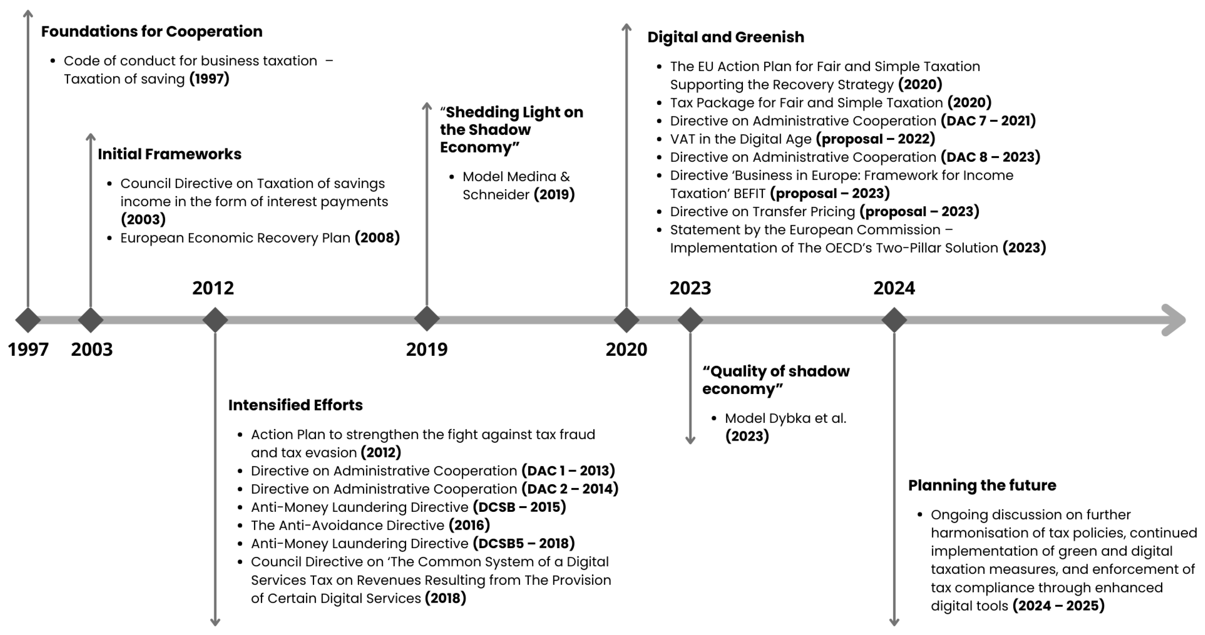This subsection aims to critically analyse the evolution of strategies and directives developed and adopted within the European Union to reduce and combat forms of tax evasion and the shadow economy. Specifically, this part of the paper does not aim to be descriptive, but rather analytical, in identifying the policies and instruments used by Member States to reduce the phenomenon of evasion, while highlighting the most essential characteristics. The elaboration of this subsection is based on a content analysis of European Union policies and initiatives aimed at combating tax evasion and promoting a fair economic environment. The initiatives and policies developed within the EU between 1997 and 2025, with the primary purpose of combating tax evasion and ensuring tax equity, were included in the analysis. The documents can be grouped into stages that reflect the involvement of the states in this phenomenon, namely (i) establishing the basis for cooperation, (ii) developing cooperation, (iii) digitalisation and (iv) developing sustainable policies in accordance with the targets of reducing the shadow economy and tax evasion.