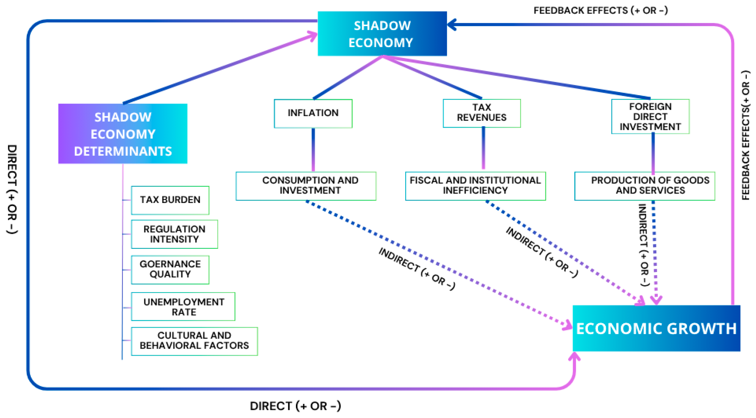 Figure 6 illustrates the relationship between the shadow economy and economic growth. First, the size of the shadow economy is determined by its determinants, namely the tax burden in a country, the intensity of regulation, the quality of governance of those in power, the unemployment rate, and cultural and behavioural factors. Second, the shadow economy can have direct effects on economic growth (positive or negative), but it can also exert its influence indirectly through the impact on inflation, tax revenues, or even foreign direct investment. Finally, certain levels of economic growth can generate feedback effects on the shadow economy. Generally, a prosperous economy contributes to a reduction in shadow economy activities.