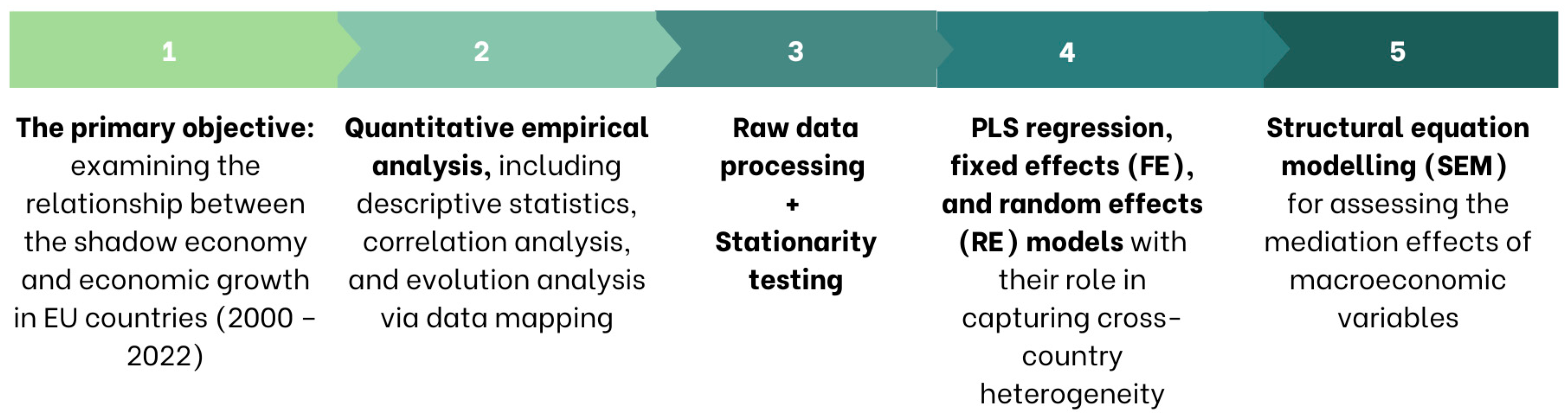 The primary objective of this research is to examine the relationship between the shadow economy and economic growth in the European Union, taking into account mediating factors such as tax revenues, inflation, and Foreign Direct Investment (FDI) over the 2000–2022 period. To meet the study’s objective, we conducted a quantitative empirical analysis using panel data with cross-country coverage. Our approach took into account the four research questions, and to formulate answers, it was necessary to identify the appropriate mix of analyses for our subject. Thus, by consulting previous studies, we selected structural equation modelling (SEM) to determine the level of mediation of macroeconomic variables on the relationship between the shadow economy and economic growth. To capture the impact of the shadow economy on economic growth across the European Union from 2000 to 2022 and to identify significant differences between countries, we employed panel least squares regression (PLS), the fixed effects (FE) model, and the random effects (RE) model. In addition, descriptive data analysis, correlation analysis and evolution analysis of variables through the data mapping method completed the mix. Both structural equation modelling and panel least squares analysis enable the construction of complex models using data structured by the country-year unit of analysis, which is why they were selected as the primary methods of analysis in our study. Additionally, fixed and random effects models enable the examination of heterogeneity across countries. The steps within the empirical section of the study were conducted in the following order, as illustrated in
