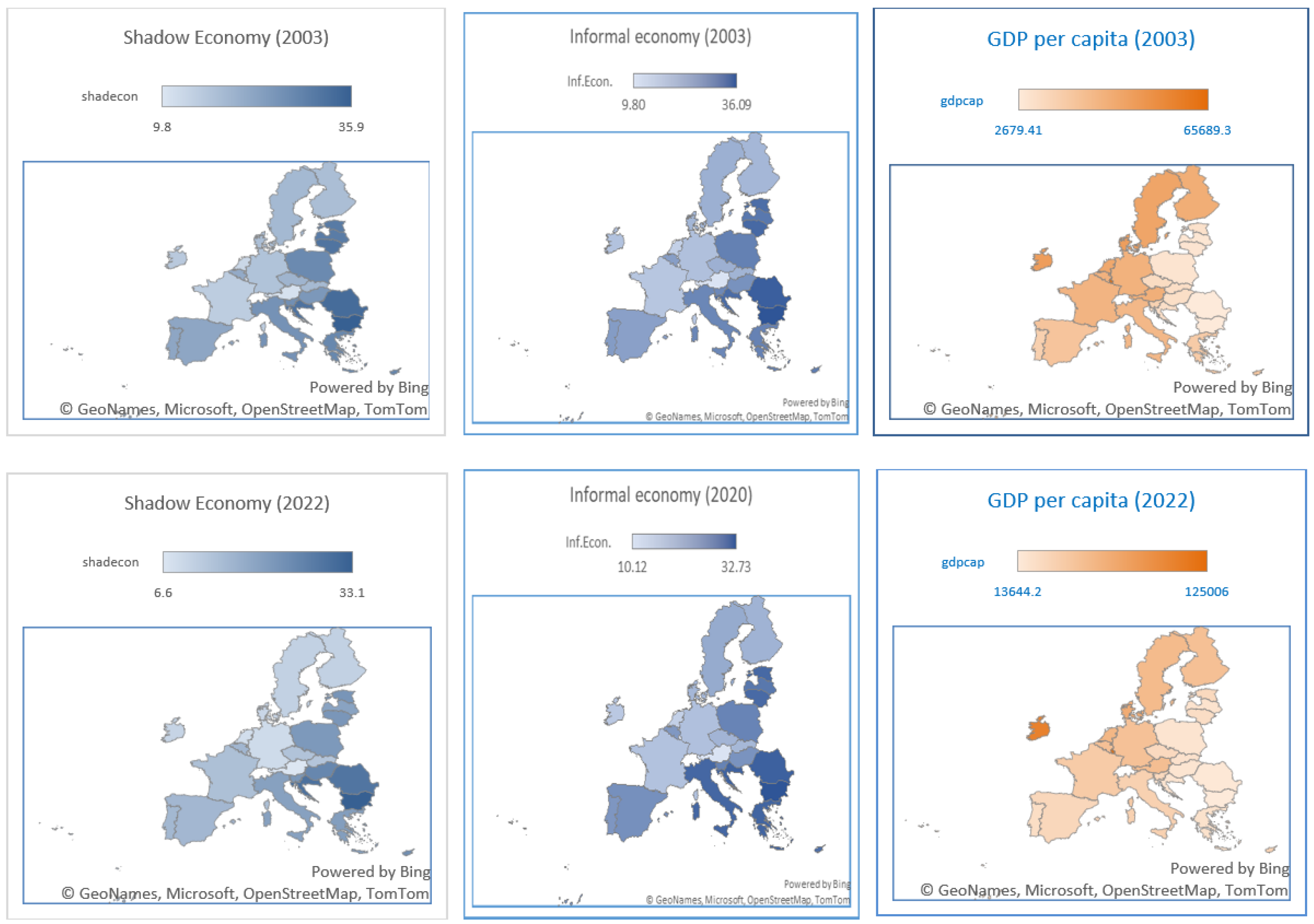 First, the paper presents an innovative perspective by defining and tracking key indicators of the informal economy, shadow economy, and development variables, and mapping their evolution over time in EU Member States from 2000 to 2022. Unlike previous research, which often treats these economic activities separately and focuses only on one aspect of the informal economy, such as tax evasion or its global dimension, our paper integrates them into a broader economic framework to assess their collective impact on economic growth. By combining development variables and mapping these changes, the study offers new insights into the long-term dynamics of the informal economy, shadow economy and its relationship with economic growth.
