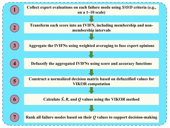 To further elucidate the inherent consistency of the proposed methodological framework, it is necessary to clarify how the various techniques interact within a unified analytical process. The framework begins with the identification of failure modes and the acquisition of expert assessments of the S/O/D criteria, which constitute the primary data sources for subsequent stages. A hybrid weighting mechanism, combining AHP and EWM, first adaptively determines subjective and objective weights by combining expert judgments with the statistical dispersion of the scoring data, thus ensuring a balance of importance and a justifiable representation. These weights are then embedded in the IVIFN modeling stage, where expert assessments are transformed into a structured representation of uncertainty, capable of accommodating membership and hesitation. In the final stage, the VIKOR method aggregates the IVIFN scoring function, generating a compromise solution that reflects both group utility and individual regret metrics. Through this progressive integration of weight determination, uncertainty description, and compromise-based ranking, the framework ensures the systematic delivery of information. It also provides a comprehensive operational path from raw expert input to prioritized risk outcomes, consistent with the process presented in Section 3.