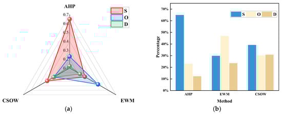 Figure 8b further highlights these differences via bar charts. AHP assigns the highest weight to S, and EWM emphasizes O, whereas CSOW-fused weights are more evenly distributed across all indicators. This balanced allocation avoids over-reliance on either expert judgment or data alone, demonstrating the method’s comprehensiveness and robustness in capturing both subjective insight and objective evidence.