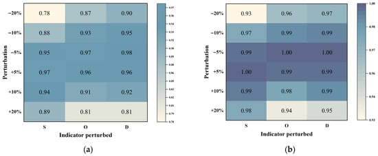 To provide a more comprehensive assessment of ranking stability, both Kendall and Spearman rank correlation coefficients were computed to evaluate the consistency between perturbed rankings and the baseline ranking. The Kendall coefficient is more sensitive to local rank swaps, whereas the Spearman coefficient captures the correlation of overall trends. The combined use of both metrics provides a more complete and robust evaluation of ranking consistency rather than relying on a single measure. Based on this analysis, heatmaps were plotted (Figure 10a,b) to illustrate overall ranking consistency. The results demonstrate that even under significant weight fluctuations, the proposed method maintains a high level of ranking stability, highlighting its reliability and robustness in practical applications.
