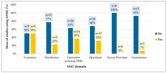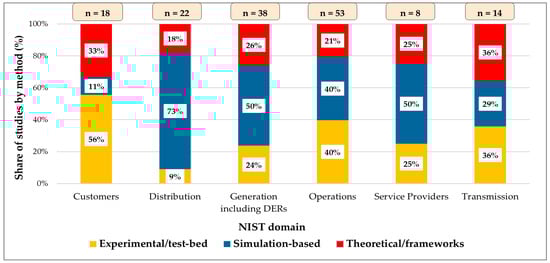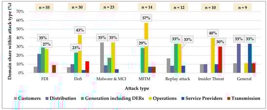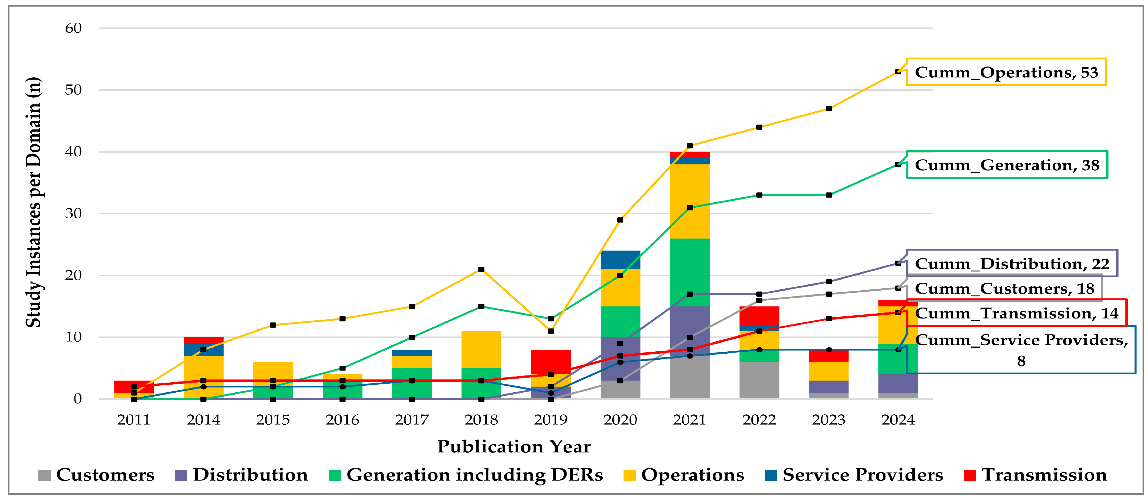 Figure 2 shows the annual count of studies classified by NIST domain (stacked bars), with cumulative totals overlaid as lines. Line endpoints indicate the overall volume by domain. We found that the annual counts for research in SG cybersecurity are modest before 2018 and then rise steadily, peaking in 2021 (n = 40 studies, where n denotes the number of studies), and remaining higher than pre-2018 levels in 2024 (n = 16) (year totals: 2011 = 3, 2014 = 10, 2015 = 6, 2016 = 4, 2017 = 8, 2018 = 11, 2019 = 8, 2020 = 24, 2021 = 40, 2022 = 15, 2023 = 8, 2024 = 16). The stacked columns show that the post-2018 increase is driven largely by Operations and Generation, with the strongest activity in 2020–2021. Within the peak year 2021, Operations (12) and Generation (11) lead, while Distribution (8) and Customers (7) also increase relative to earlier years. Transmission remains consistently sparse (≤3 per year since 2021), and Service Providers are low throughout (≤3 per year). Overall, Operations had the greatest cumulative coverage (n = 53; 35%), followed by Generation (n = 38; 25%) and Distribution (n = 22; 14%). By contrast, Transmission (n = 14; 9%) and Service Providers (n = 8; 5%) were markedly underrepresented, with Customers (n = 18; 12%) ranking third from the bottom. It is interesting to note that none of the studies were classified as part of the Markets domain. This could reflect (i) a misclassification of a few borderline studies whose focus on bidding, settlement, or dispatch economics was integrated within Operations or Service Provider domains, or (ii) an unbalanced search strategy. Additional reasons may include the following: (iii) Markets-focused cybersecurity work may appear in energy economics, finance, or policy outlets that use non-NIST terminologies; (iv) threat prioritization toward safety-critical operations over market economic impacts may bias researchers and funders toward Operations/Distribution; (v) ambiguity at the Operations and Markets boundary leads our classification to default to Operations. Collectively, those are some factors that likely suppressed Markets domain coverage in our study.