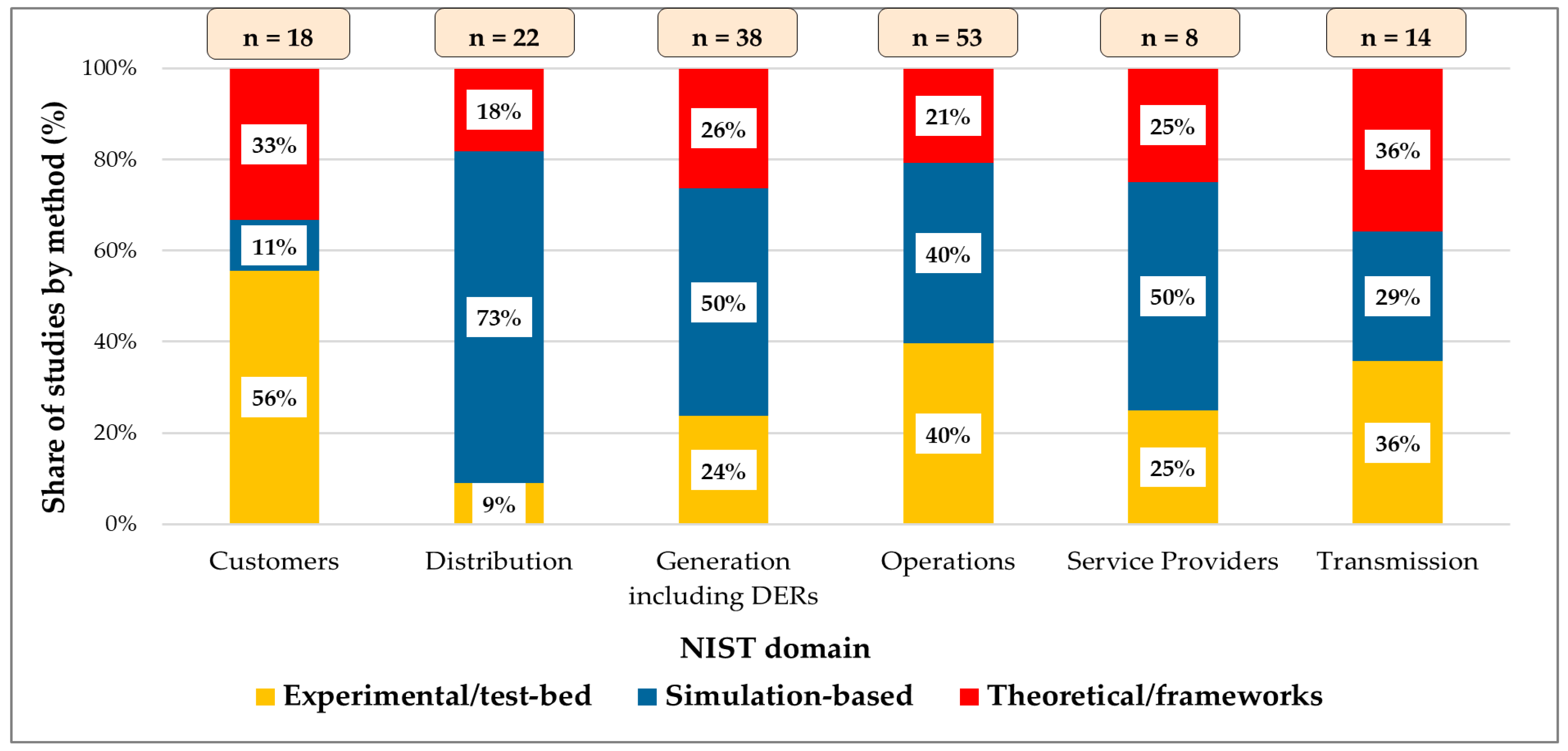 - A NIST seven-domain mapping of recent SG cybersecurity research with a joint trend analysis of domain × method (simulation/theoretical/testbed) and domain × attack type;