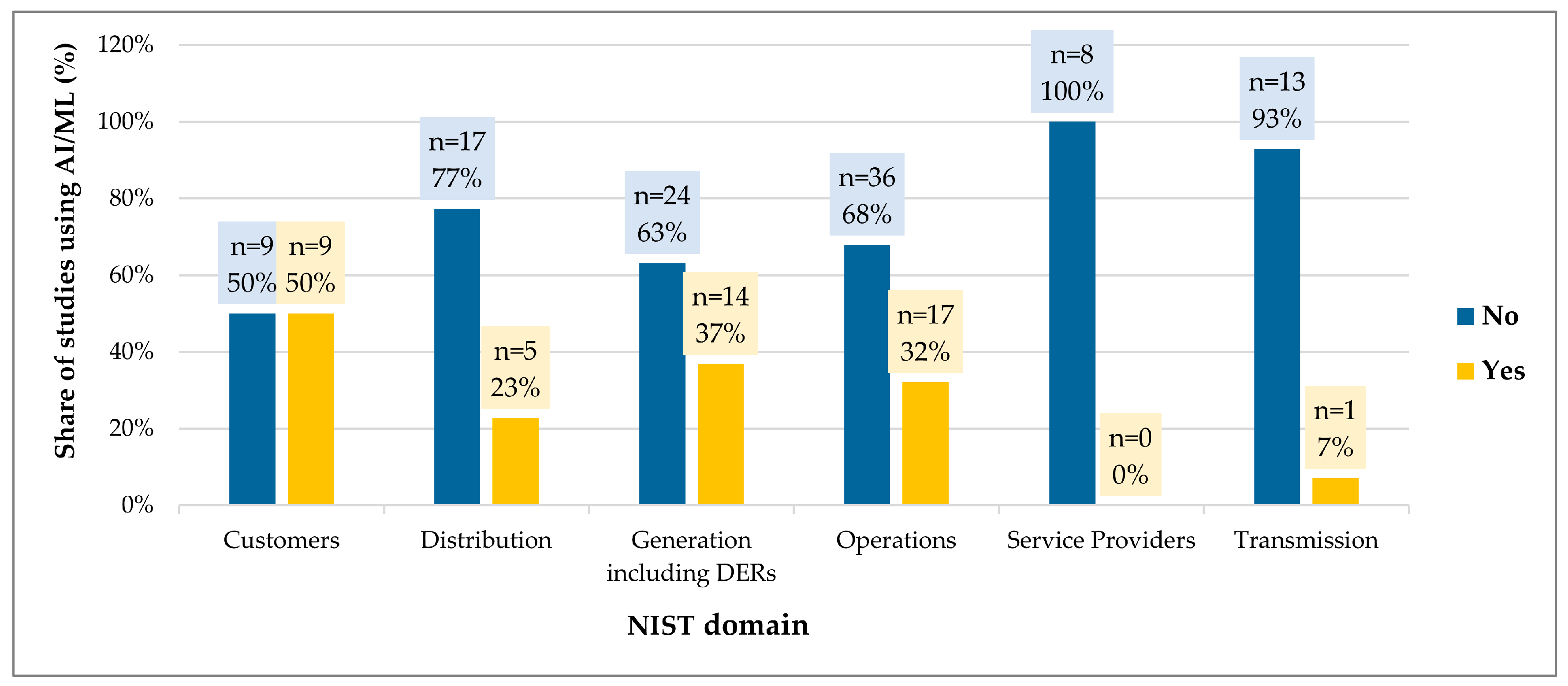 The motivation behind Achaal et al.’s work [7] aligns closest with that of our work; however, there are key differences in the broader objectives and findings. The primary goals in [7] were to cover all aspects of SG cybersecurity (identification, response, and recovery, in addition to protection and detection mechanisms) and guide organizations in following a complete security routine based on scientific countermeasures at every step (explicitly mapping studies to the recommendations of NIST’s cybersecurity functions—Identify, Protect, Detect, Respond, and Recover) for a select few studies, whereas the primary objective of this study, as mentioned earlier, is to identify and present broad, system-level trends in SG cybersecurity research rooted in the mapping of NIST domains affected by three areas (attack type, platforms/tools used, and methodology). Therefore, while studies such as [31,55] emphasize technical rigor, the focus of our work is placed instead on presenting and analyzing trends across all SG domains in relation to the practical implementation areas.