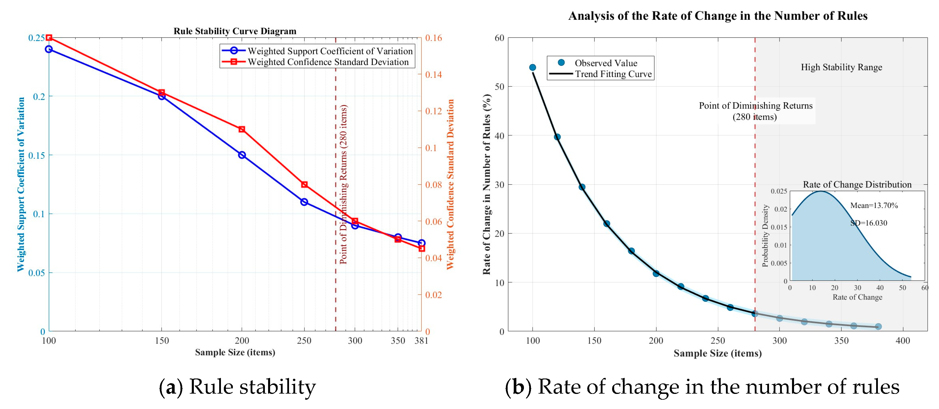 Figure 6b shows that as the sample size increases, the rate of change in rules significantly decreases. The point of diminishing returns, where the absolute value of the curve’s slope is first ≤0.05, occurs at 280 samples. Beyond this point, the improvement in stability from increasing the sample size is no longer significant, meaning the number of rules is relatively stable. The above results indicate that the improved Apriori algorithm performs well with small samples, and the 381 samples in this study are within the high stability range, ensuring high reliability of the results.