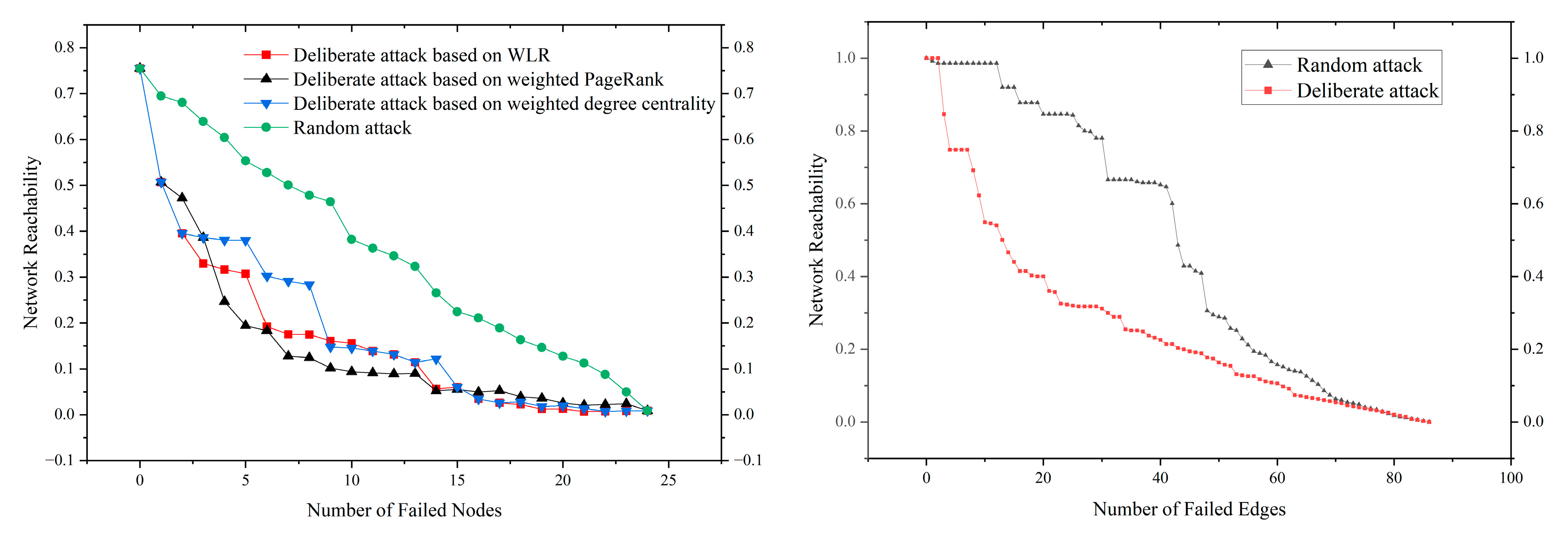 We implemented two distinct node attack strategies—random attack and deliberate attack—to assess their impact on network robustness. Random attack sequences were generated via Monte Carlo simulation, while deliberate attacks were executed based on node importance metrics, including weighted degree centrality, WLR values, and weighted PageRank centrality. The results of these attacks are illustrated in