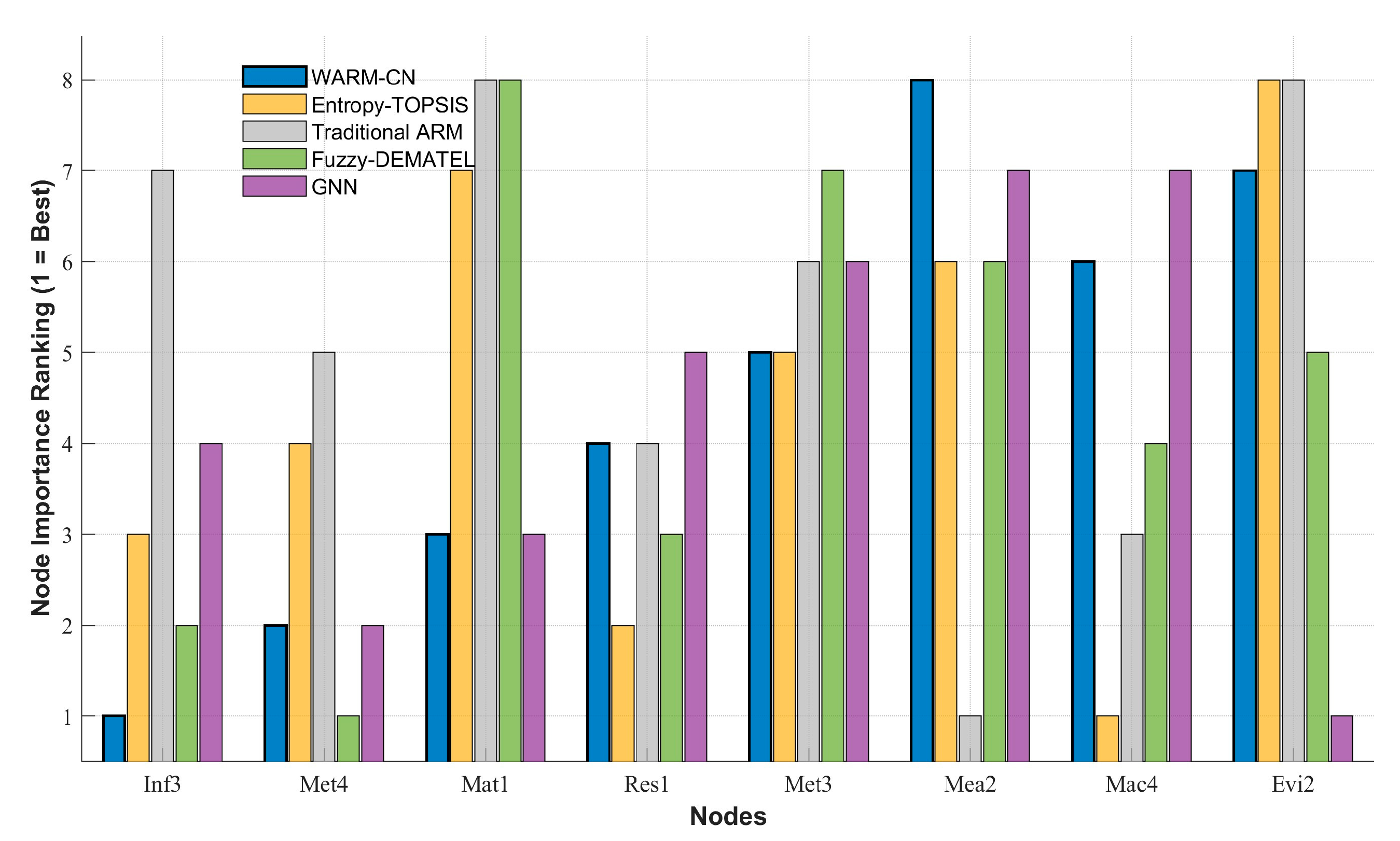 To empirically validate the advanced nature and uniqueness of the proposed WARM-CN framework, a comparative analysis was conducted with four representative methods. These methods include entropy-weighted TOPSIS, which relies on attribute data; traditional Association Rule Mining, which is based on undirected associations; Fuzzy-DEMATEL, a technique that integrates expert knowledge with systemic relations; and Graph Neural Networks representing the cutting-edge direction of artificial intelligence. The normalized importance assessments of the eight key control points by these methods are shown in
