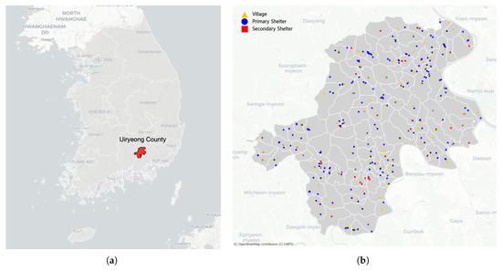 (a) Geographical location of Uiryeong County. (b) Spatial distribution of villages and shelter candidates. Data source: © OpenStreetMap contributors, ODbL.