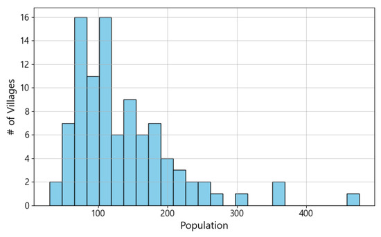 Population data for each village, denoted as , were obtained from the most recent census published by Statistics Korea (KOSTAT) [79], representing the number of residents requiring evacuation from each village. Figure 3 presents the distribution of , highlighting the variation in population size among villages. The main residential clusters within each village were identified from high-resolution settlement data and used as representative points for computing travel distances to shelter candidates, ensuring that the spatial configuration of the model accurately reflects the actual population distribution.
