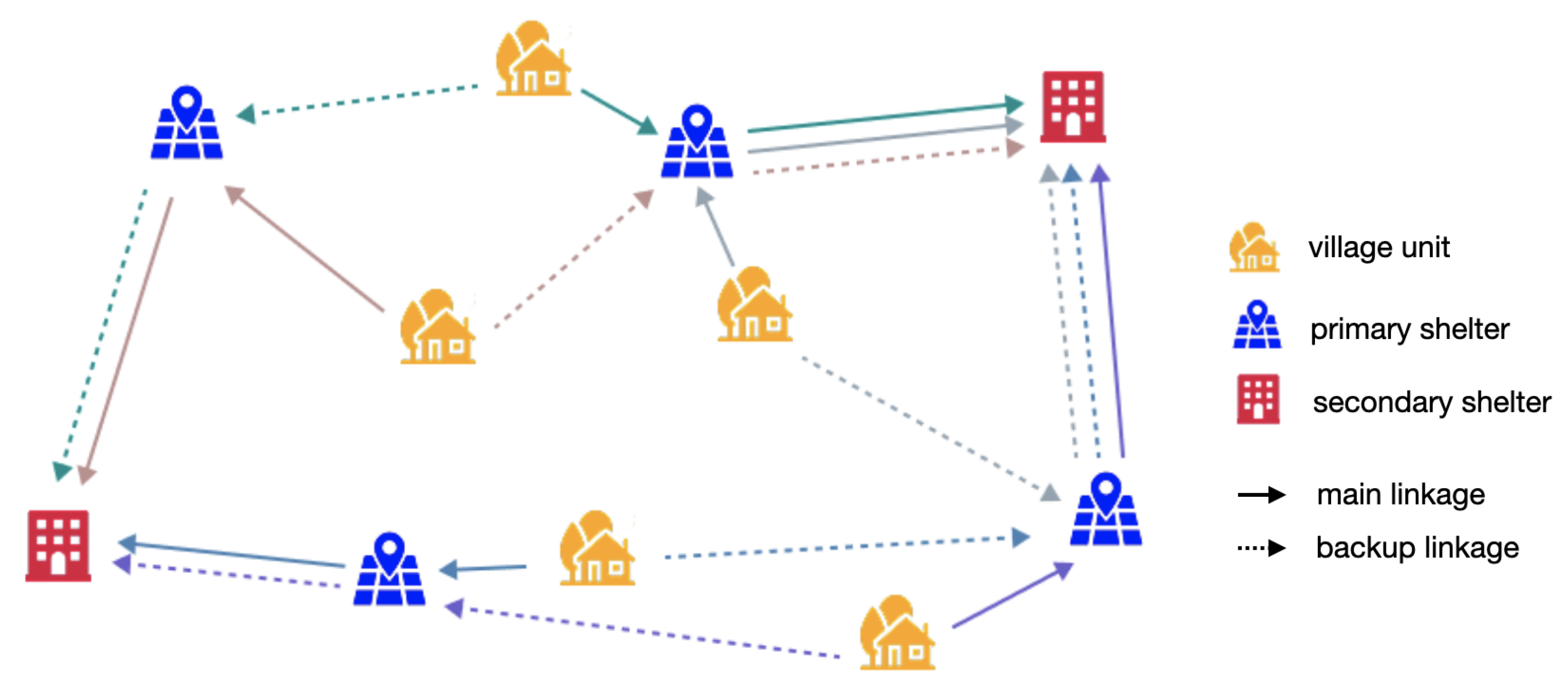 | Binary variable that equals 1 if village unit i is assigned to primary shelter j and subsequently to secondary shelter k through the backup evacuation linkage, and 0 otherwise. | |