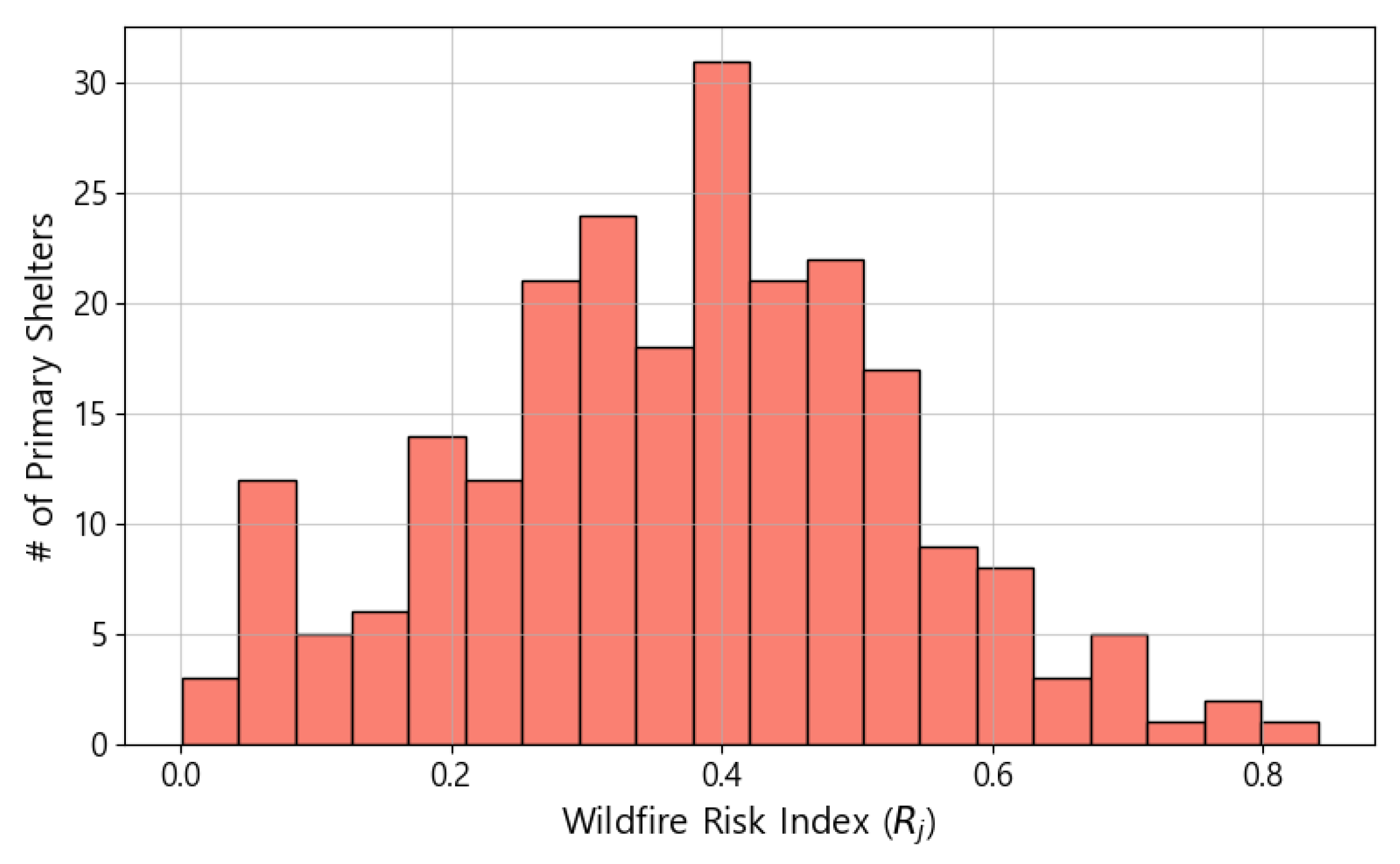 | Upper limit on the population-weighted wildfire risk of selected primary shelters | |