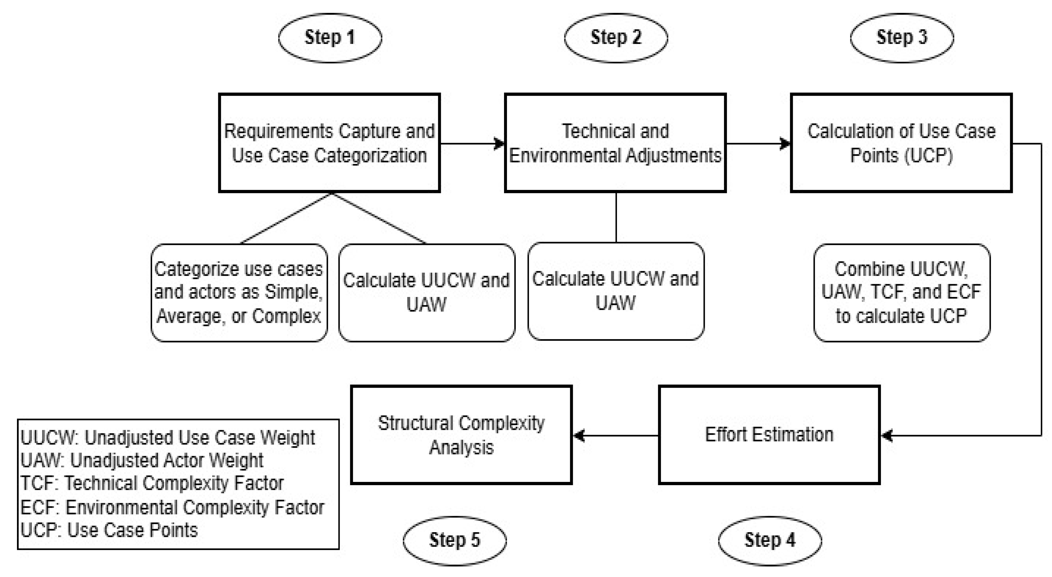 24], originally developed by Gustav Karner in 1993. Use cases, a subset of UML modeling methodologies, are used to specify the system requirements that form the basis of the UCP idea. The use cases are then used to determine the software size, which is then factored to take into account technical and environmental factors. The expected effort for the realization of a software project can then be determined on the basis of this UCP. The size estimate can be determined by looking at the Unadjusted Use Case Weight (UUCW), the Unadjusted Actor Weight (UAW), the Technical Complexity Factor (TCF), and the Environmental Complexity Factor (ECF).