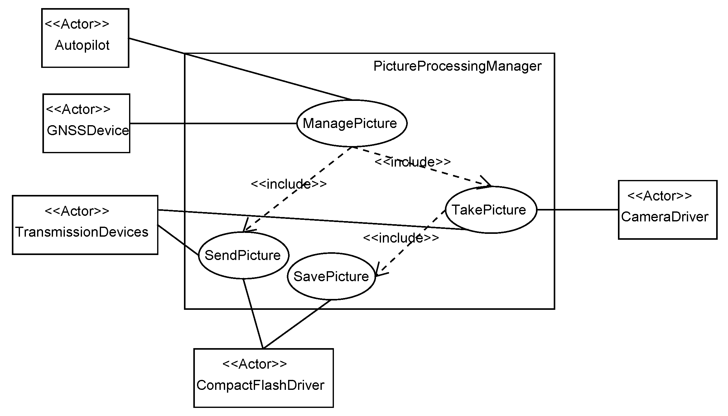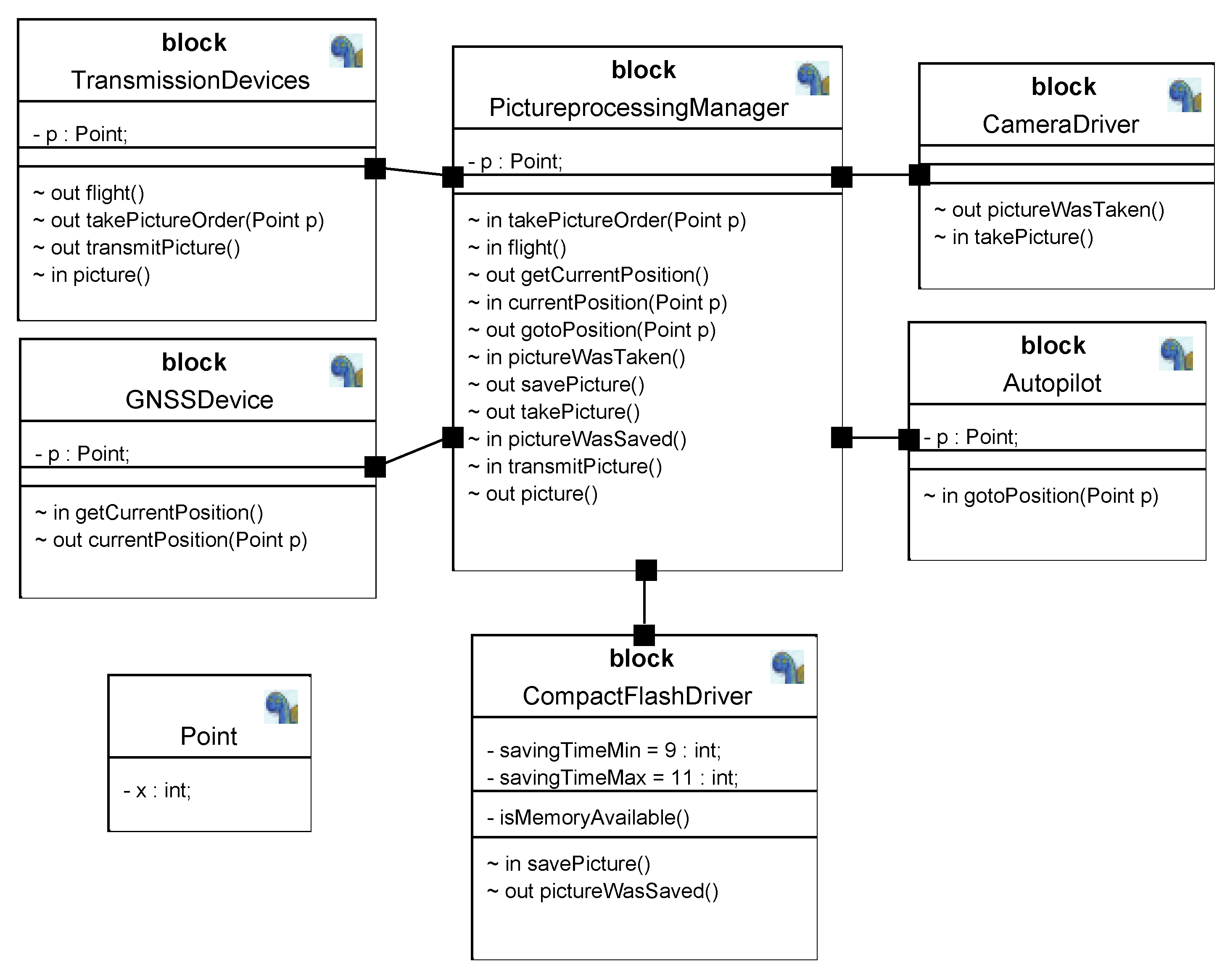 The first model (M1) models a drone whose coordinates are obtained via a GNSS device. The autopilot instructs the drone to a location, the camera driver takes the picture, and the picture processing manager sends a signal to the compact flash driver to save it.