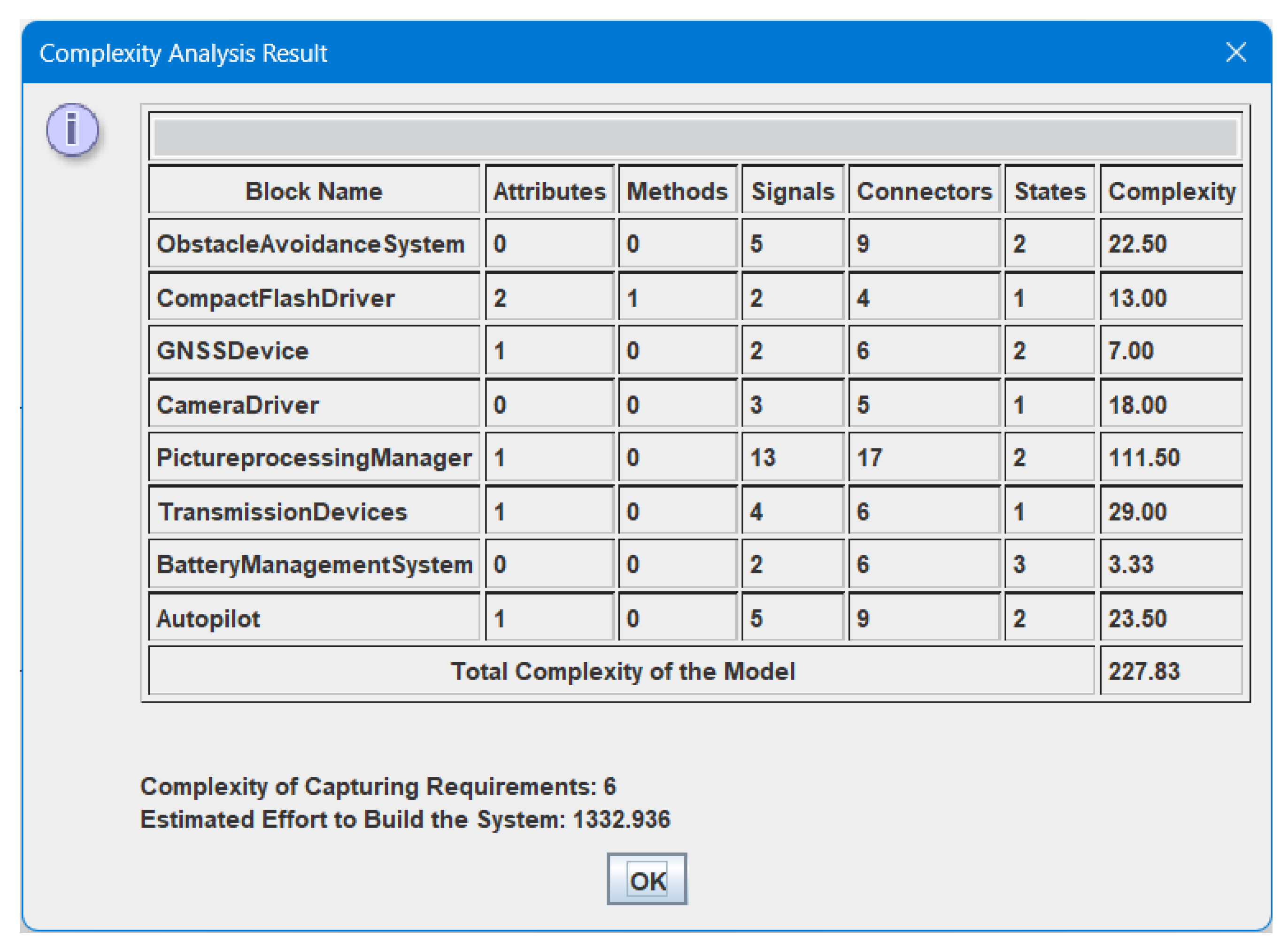 In operation, the prototype thus bridges diagram-level model artifacts and composite complexity assessment: cyclomatic metrics computed per state machine are combined with block-adjacency and use-case/requirement indicators to produce an overall complexity and effort estimate. The implementation approach—standalone, XML-driven, and programmatically accessible—enables broad, multitool usage and provides a practical foundation for empirical calibration, weight tuning, and extension to additional structural patterns (for example, concurrency or hierarchical states) in future work.