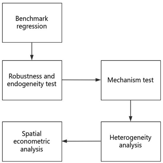 Figure 2 shows the research process of this paper. First, a benchmark regression is performed to test the core hypothesis, which is hypothesis 1 of this paper (artificial intelligence makes a significant contribution to the cultivation of new quality productive forces in enterprises). Second, the results of the benchmark regression are tested for robustness and endogeneity, respectively, to ensure their robustness and increase the scientificity and reliability of the conclusions. Third, the mechanism test is conducted to test the mechanism path of AI affecting new quality productive forces in enterprises and to verify hypotheses 2–5. Fourth, a heterogeneity analysis is conducted to verify the heterogeneity of the effect of AI on new quality productive forces in enterprises when the property rights of enterprises, the background of executives, the degree of competition in the industry, and the nature of the industry are different. Fifth, spatial econometric tests are conducted to verify the spatial spillover effect of AI on firms’ new quality productive forces and to test hypothesis 6.
