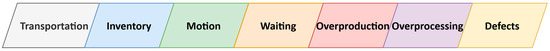 Lean production systems, or lean manufacturing, are concepts of management applicable in many industry sectors that describe production processes as defined under the lean concepts [11]. The main principles of lean are the reduction of the seven wastes, or Muda, described in Figure 1. Taiichi Ohno, the co-developer of the TPS, emphasized that the portion costs in non-lean manufacturing environments are attributed to various forms of waste. The identified forms of waste are as follows:
