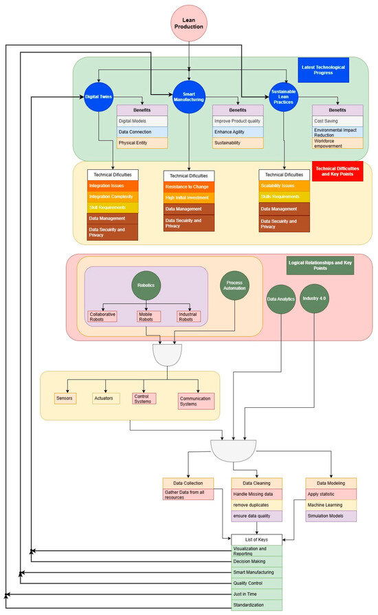 Figure 3: The logical relationship among the frontier technologies of lean production provides a comprehensive framework that shows three main categories—digital twins, smart manufacturing, and sustainable lean practices—which demonstrate the logical connections between lean production and technological advancements. Lean production is the primary concept of this figure that prioritizes waste elimination, efficiency improvement, and value creation. Each of the technological advancements—digital twins, smart manufacturing, and sustainable lean practices—represents unique benefits while facing distinct challenges.