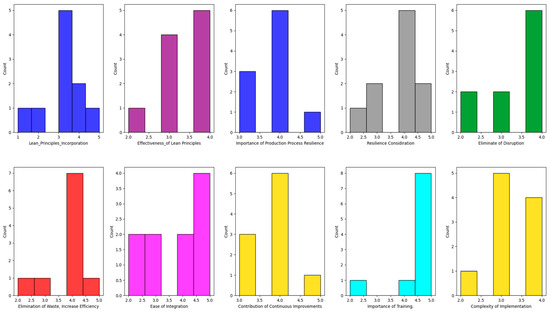 - Lean principles incorporation: The histogram shows a concentration around the mid-scale. This indicates how lean principles are incorporated into robotics systems, and it implies that there is still room for improvement in organizations, while others have already integrated lean principles into their manufacturing systems;